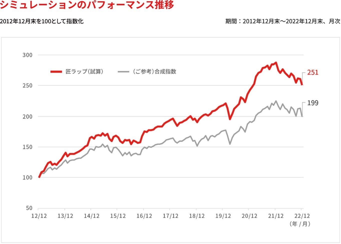 ※ 匠ラップ(試算)は、2012年12月末から2022年12月末までの過去データを用いたシミュレーション結果であり、匠ラップの運用実績ではありません。匠ラップの将来の運用成果等を示唆あるいは保証するものではありません。運用にかかる費用については、手数料および信託報酬として運用資産額の年1.46% (年率・税込)を控除しています。分配金やリバランス時の譲渡益にかかる税金は考慮していません。詳しくはWEBページ「シミュレーションの前提条件について」をご参照ください。