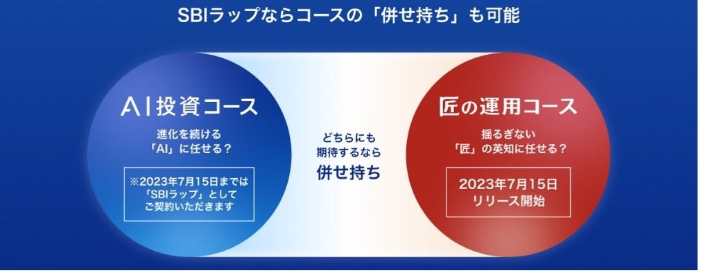 匠ラップの提供開始に合わせ、従来の「SBIラップ」は「SBIラップ AI投資コース(愛称:AIラップ)」(以下「AIラップ」)に名称を変更します。お客さまは、AI投資に基づきインデックスファンドに投資を行うAIラップと、「オールウェザー・ファクターアロケーション戦略」に基づきアクティブファンドに投資を行う匠ラップとの2種類のラップコースをご活用いただけます。
