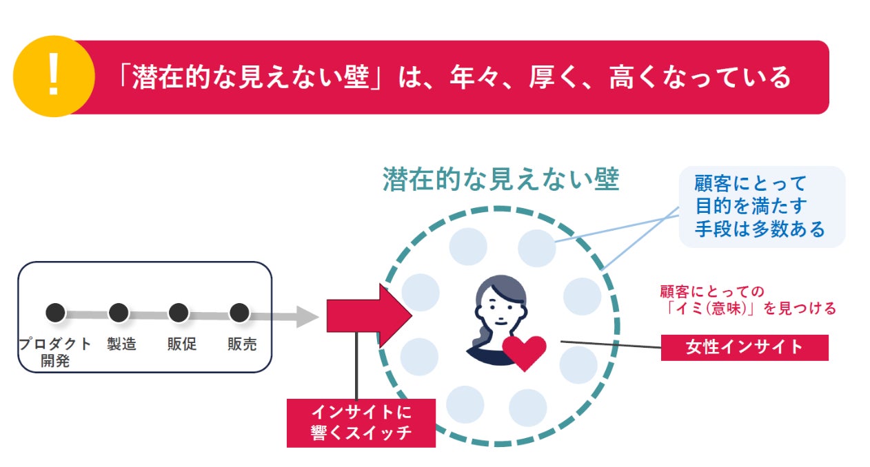 「なぜ売れないのか?」という問いに対し、35年の研究が導き出した最も大きな理由は、女性顧客側に存在する「潜在的な見えない壁」を企業が突破できていないことです。この「壁」は年々厚く、高くなっているため、顧客の購買行動に強く影響が起きています。