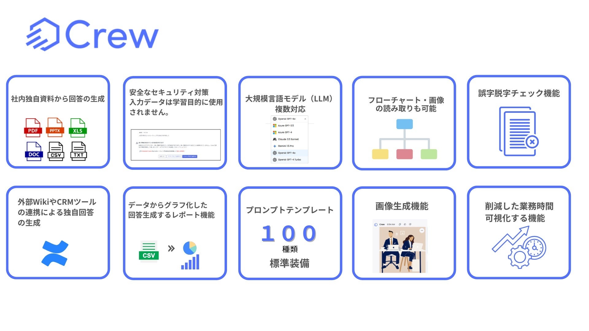 「Crew」は、ChatGPTをビジネスで安全に利用するプラットフォームです。センシティブ情報の検出、従業員の権限管理、そして社内文書に基づく会話支援を提供し、業務効率の向上をサポートします。