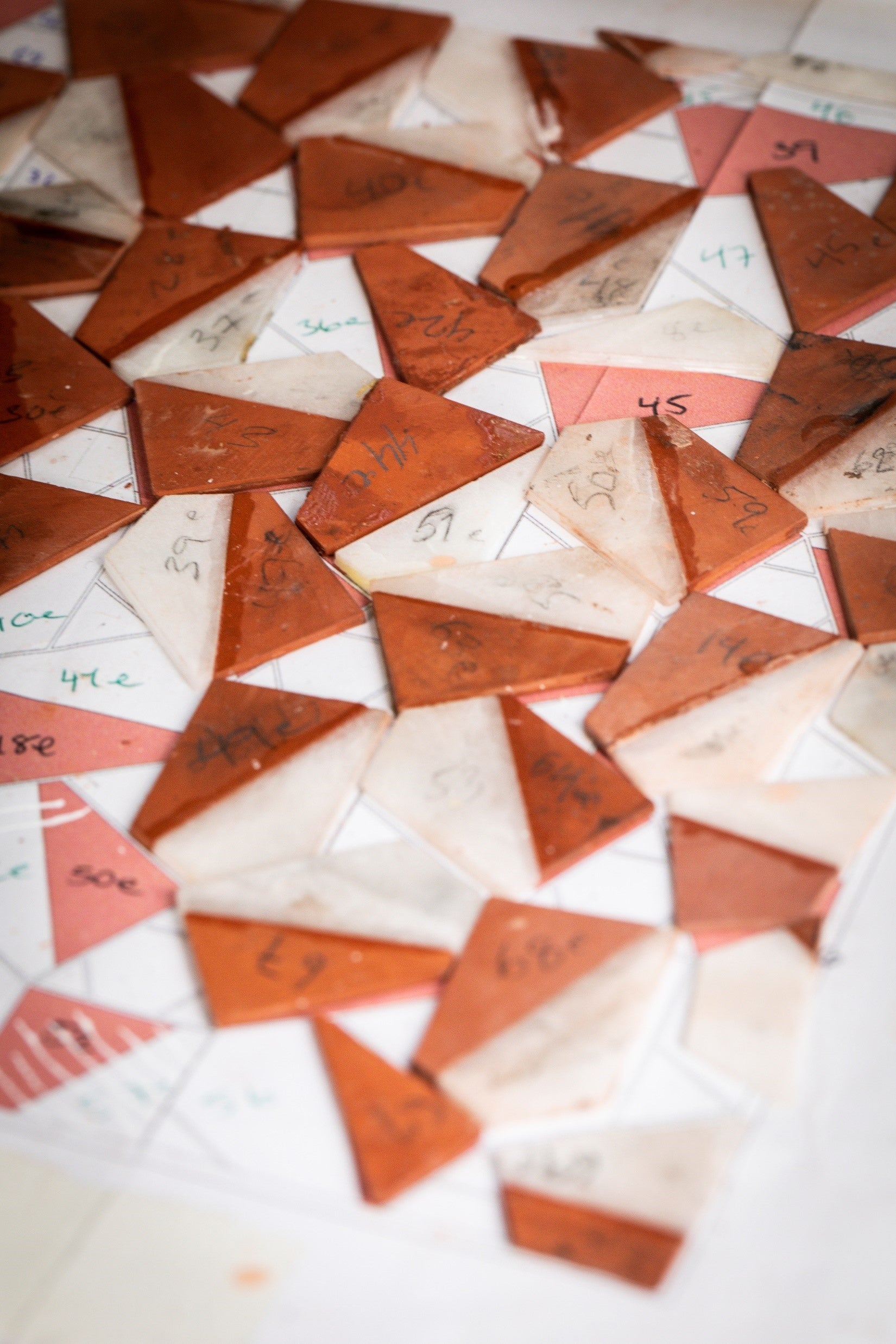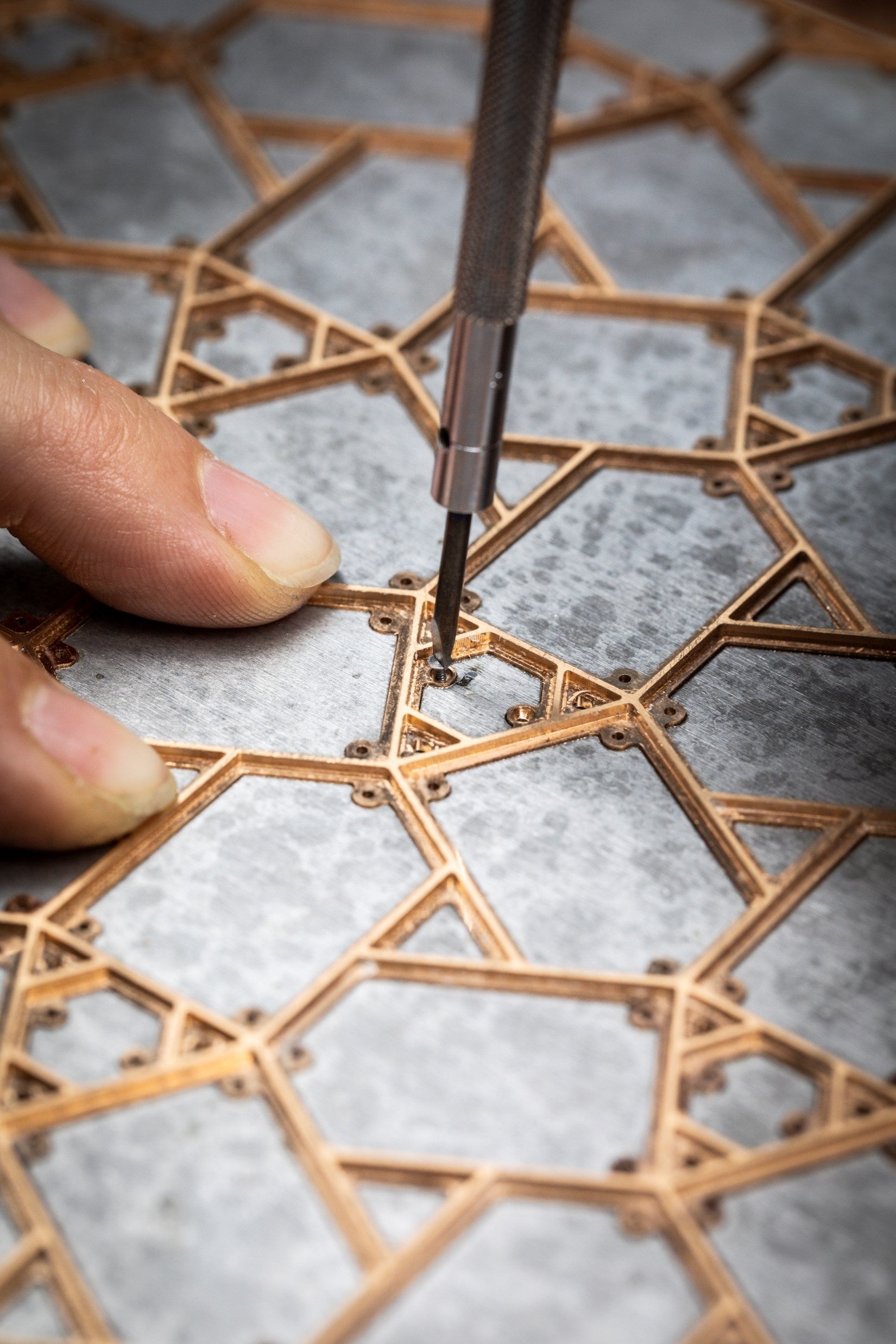 この美を具現化するためにヴァン クリーフ&アーペルは様々な専門的技術を持つ職人たちと協力しました。箱の立体構造を構築する技、幾何学的デザインをモザイクで仕上げる技、モザイクをはめ込むための緻密な枠組みを造形する技、有機的な素材を吟味し、その重さや質感までも見極める技、作品を隅々まで美しく磨き上げる技など、まぎれもなく本物の伝統的なジュエリー制作の様々な技巧を持つ職人たちが互いに、それぞれの専門分野の仕事を尊重しながら自身の技を存分にふるいました。この作品では特に、幾何学的な形のモザイクに使用する素材の選択に特別な注意が払われました。森口氏により示された作品デザインに存在する友禅の色彩や蒔糊の技法を表現するするために様々な素材がひとつひとつ吟味されました。選び抜かれた、レッドジャスパーやマザーオブパール、ブラックエボニーや棕櫚の木などの自然の素材が組み合わされ、森口氏のデザインイメージと一体化した作品は、友禅の精神は共有しながらも、それとは異なる世界を創造しています。