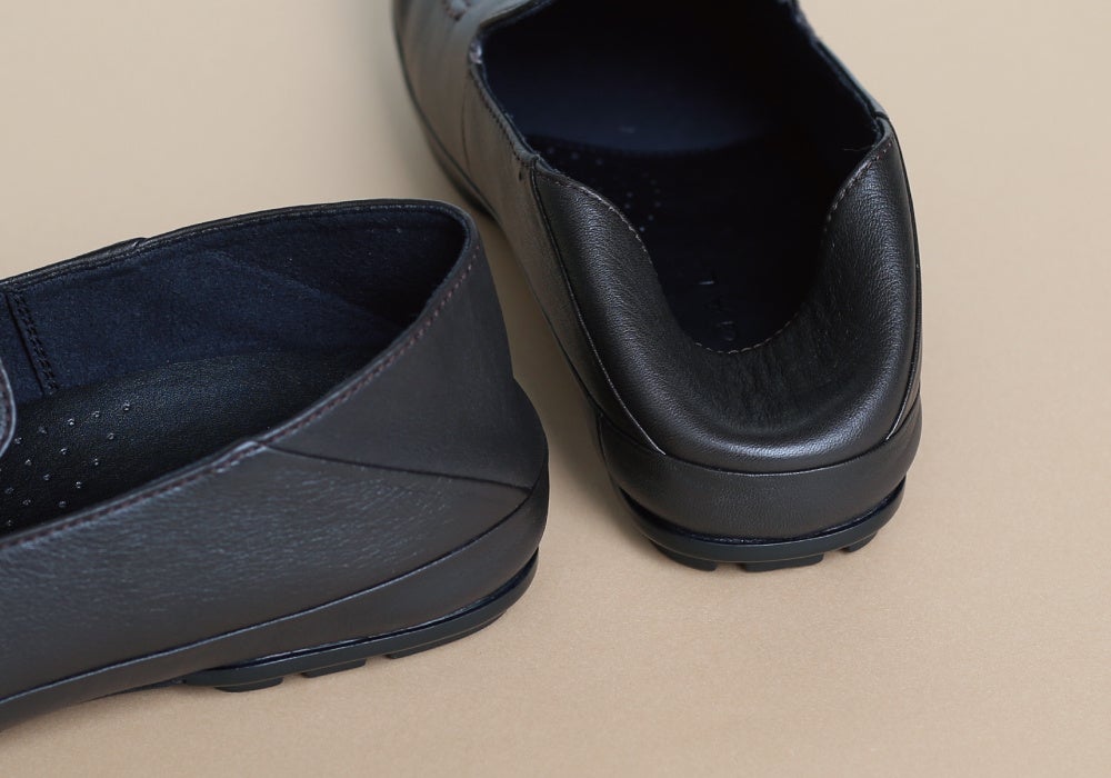 踵、サイド部分は折りたたむことも考慮した切り返しデザインで全体のシルエットを崩さないような細かい工夫が盛り込まれています。旅先や出張先でリラックスして履いていただけることはもちろんのこと、オフィスでも大活躍間違いなしです。