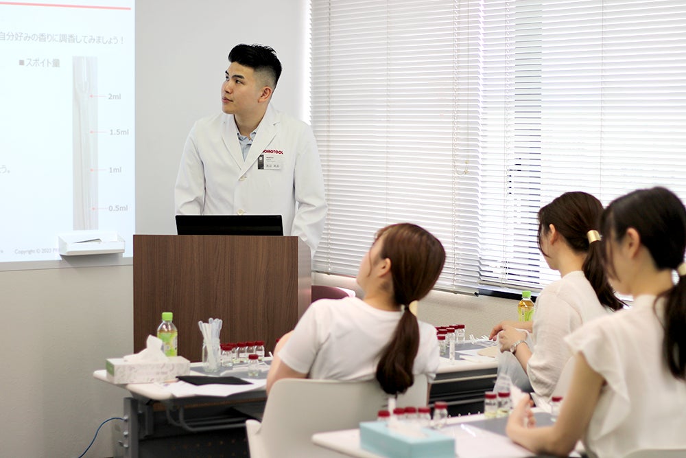 本研修は、6月下旬から3回に分けて当社本社のセミナー会場にて実施いたしました。約20名の方にご参加いただき、参加された方々からは、「調香体験でオリジナルの香りを作ることができ、大変楽しく貴重な経験ができた」、「講義だけでなく講義の内容を反映させる実技もあって、知識が深まった」、「体系的に学ぶことができ、接客時にお客様に伝えられる知識が増えた」、といった感想をいただきました。