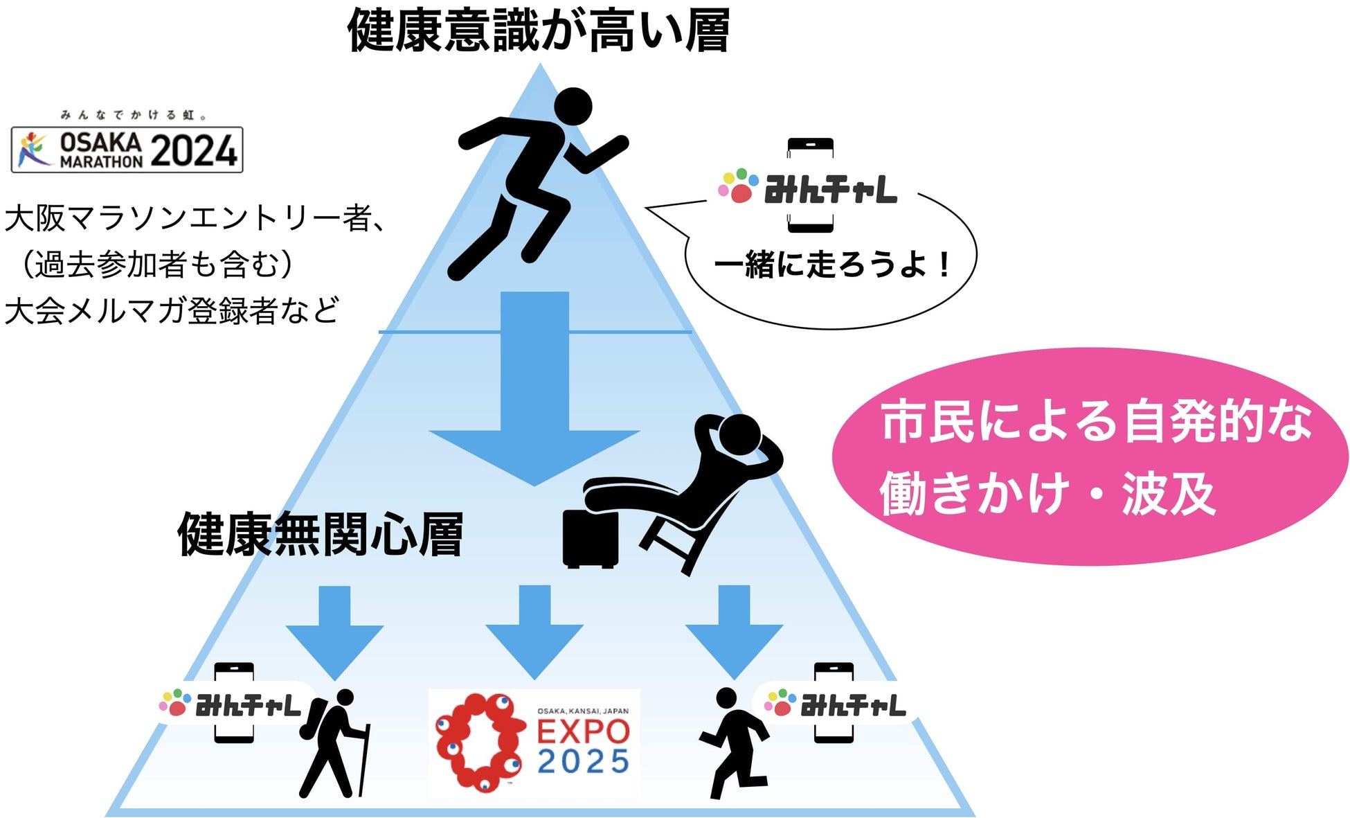 「みんチャレ」は、習慣化を目指すユーザー同士のコミュニティーアプリです。市から対象者への直接的な働きかけだけでなく、大阪マラソン2024をきっかけとして、健康意識の高い市民から健康無関心層に働きかけ、市全体に運動習慣の輪を広げます。さらに将来は、本事業を大阪万博も見据えて市民の健康を支える事業展開を目指し、本事業を通じて大阪市民の健康づくりに貢献します。