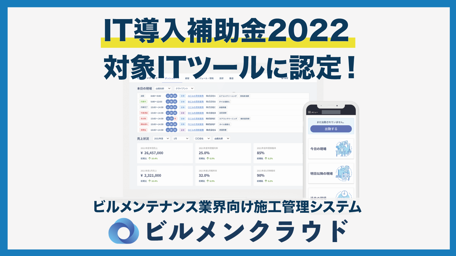 ハウスクリーニング・法人向け清掃や修理・お手入れのサービス産業をIT化する日本最大級のプラットフォーム「ユアマイスター」を運営するユアマイスター株式会社(本社:東京都世田谷区、代表取締役社長:星野貴之)は、「IT導入補助金2022(サービス等生産性向上IT導入支援事業)」のIT導入支援事業者として採択され、当社が開発・提供するビルメンテナンス業界の生産性や収益性を向上するクラウド型施工管理システム「ビルメンクラウド」が補助金の対象ITツールに認定されました。「ビルメンクラウド」導入時の初期費用および最大1年分の利用料金に対し、30万円〜150万円未満の導入補助金(補助率1/2以内)が交付されます。