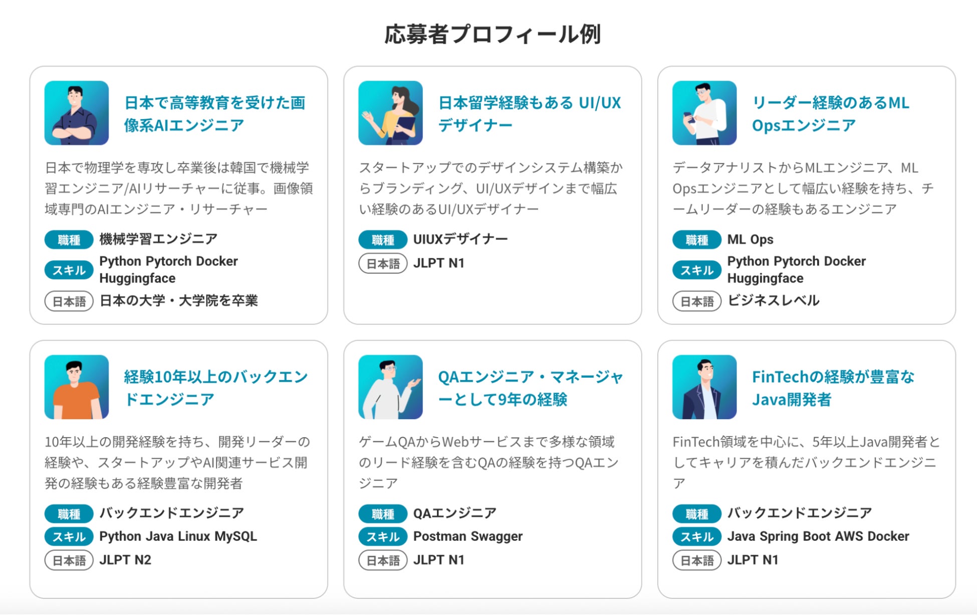 韓国のITエンジニアは、日本語習得率が高く、日系企業の勤務経験者や日本文化への親和性も高い人が多いと言われています。そのため、その他の外国人材と比べてカルチャーフィットを求める日本企業に適した人材を採用できる可能性が高いと言えます。これまでのクローズドβでのご提供期間では、AIエンジニアやUI/UXデザイナーなどの日本語もスキルも優れた方からの応募がありました。