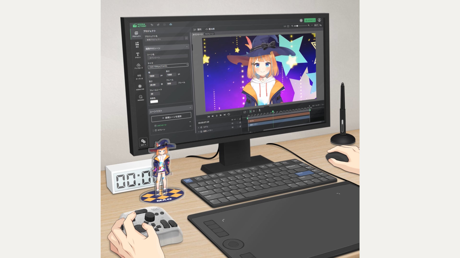 クリエイターのデスクを再現しており、あらかじめ用意された腕差分にモーションを適用させることで、TourBoxを使って動画編集やイラスト制作、Live2Dモデリングをしている構図を簡単に作成することができます。テンプレート素材では、画面の中のソフトの表示を切り替えたり、自身のキャラクターを当てはめることができるアクリルスタンドといったギミックも充実。動画クリエイターやイラストレーター、モデラーの方がSNS等での投稿用に活用いただける素材となっています。
