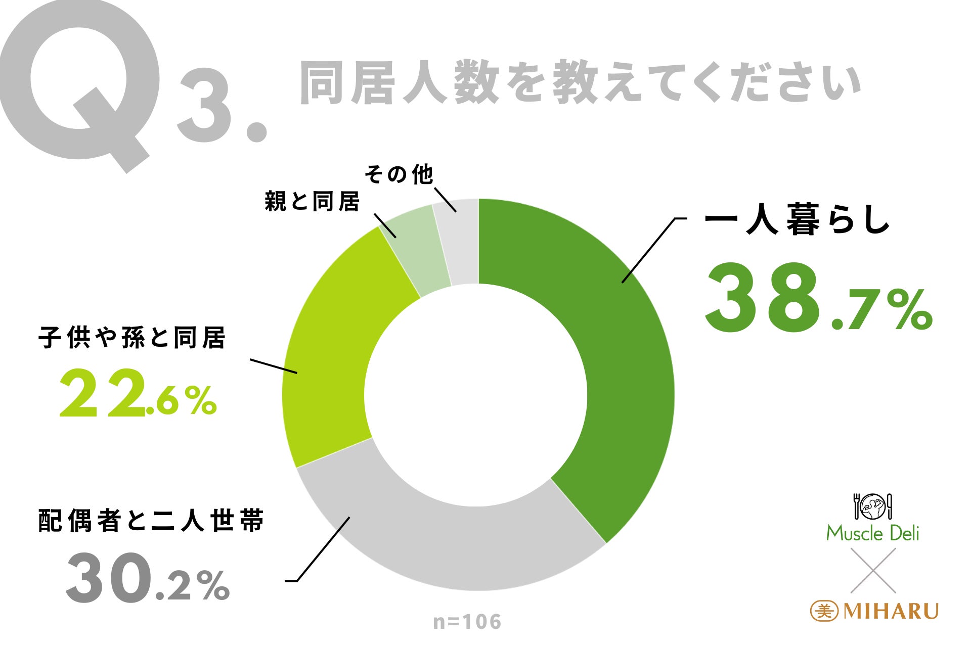 - Q3.一人暮らしの割合は38.7%、配偶者と二人世帯が30.2%。