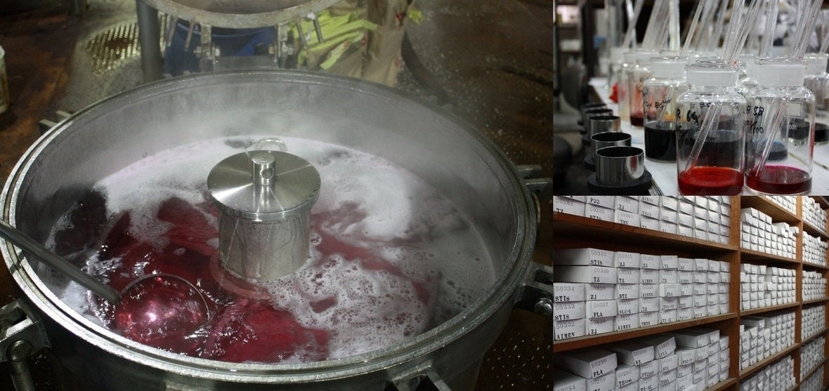 その原毛の色合いを見て3 〜 7 色の複数色を選び目指す色を表現する染料選定を行います。