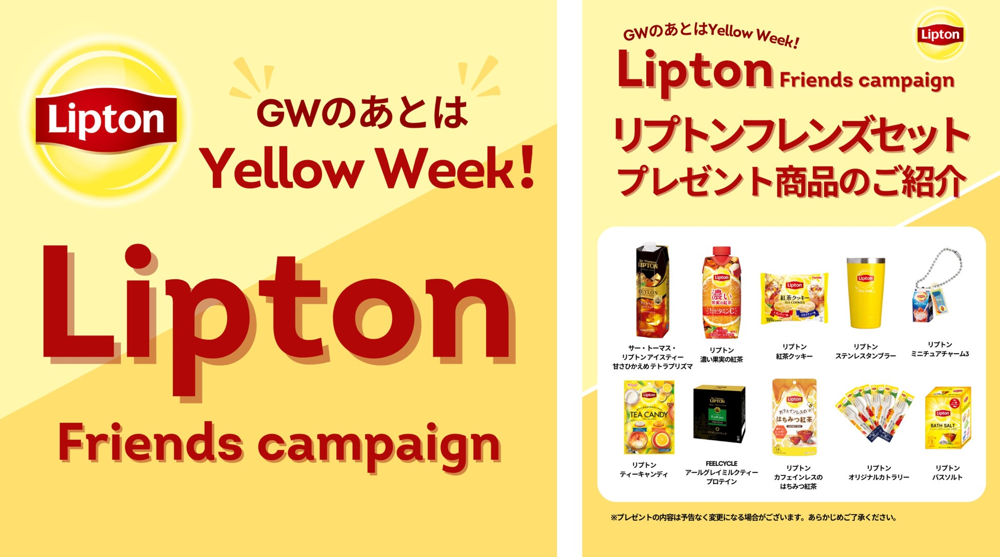 GW明けは気分が切り替わらず、なんとなく疲れを感じてぼんやりと過ごしてしまう方も多いかもしれません。紅茶を通してよりハッピーな時間をお届けしたいと考えるリプトンは、GW後の期間を”Yellow Week”と命名。個性豊かなリプトンフレンズ(=リプトンとのコラボ商品)が当たる豪華キャンペーンを実施いたします。今年もリプトンフレンズと共に、毎日みなさんの日常生活を支えるほっこりとした投稿を通して、連休明けの気持ちをもっと前向きにしてくれるアイディアをお届けします。