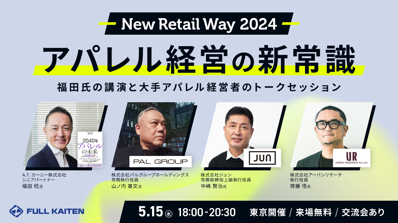 5/15(水)に『NewRetailWay2024アパレル経営の新常識』と題したイベントを福田稔氏とパルグループホールディングス・ジュン・アーバンリサーチの3社役員をゲストに迎え、開催いたします。