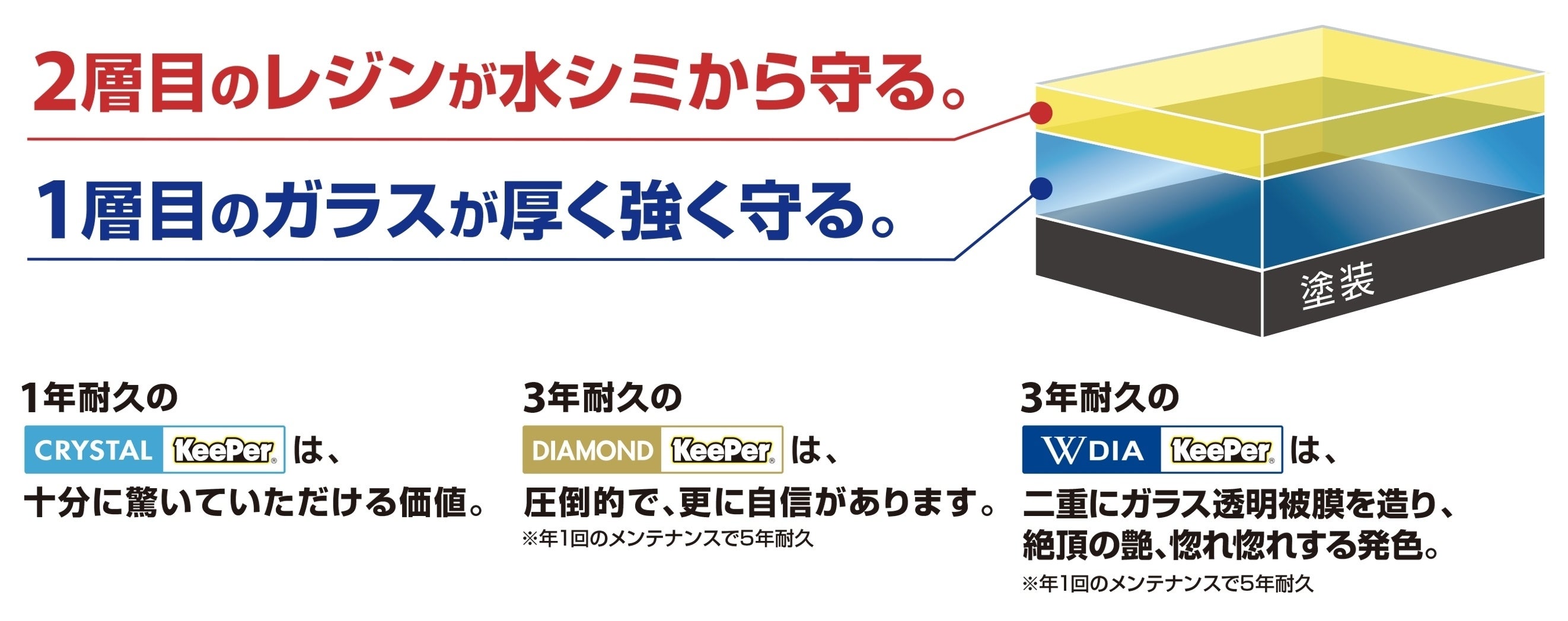 車の塗装そのものが持っている本質的な輝きを引き出し、「車を守る Wの透明被膜」それがキーパーです。