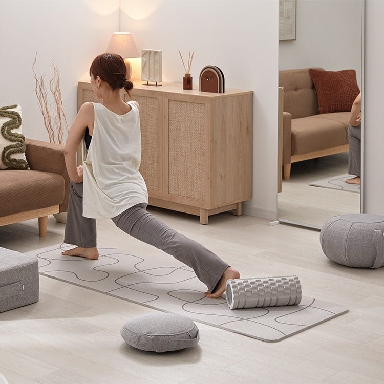 そこで今回登場したのが、180cmの大判サイズで厚さ1cmのしっかりとしたマット。トレーニング用だけでなく「サイドラグ」としても活用できるよう、インテリアに馴染むグレーの落ち着いたカラーと洗練されたデザインを採用しました。