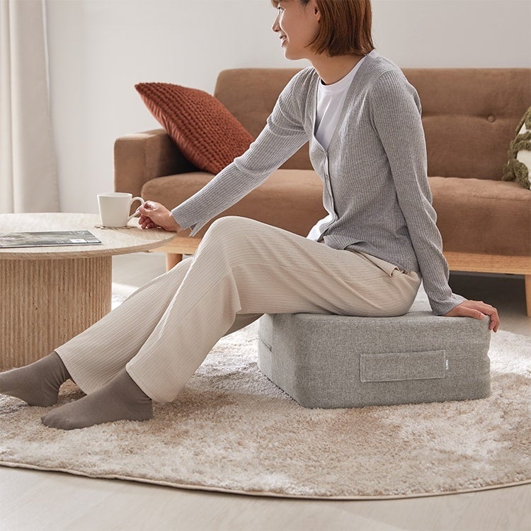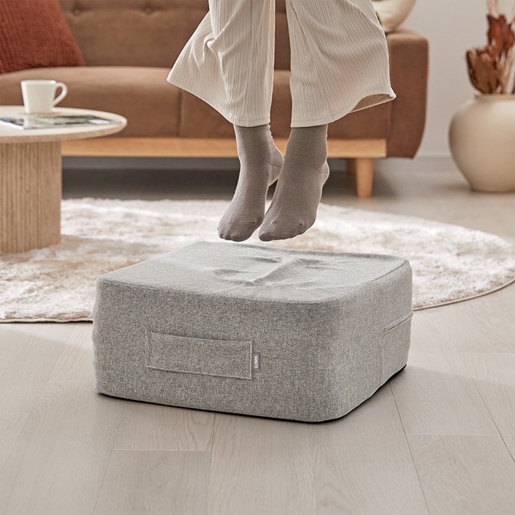 トランポリンのように楽しく飛んで、体幹のボディメイクの一役を買う「ジャンプマット」。今回はインテリアに馴染むグレーカラーで、オットマンやフロアクッションとしてもお使いいただけるデザインに仕立てました。