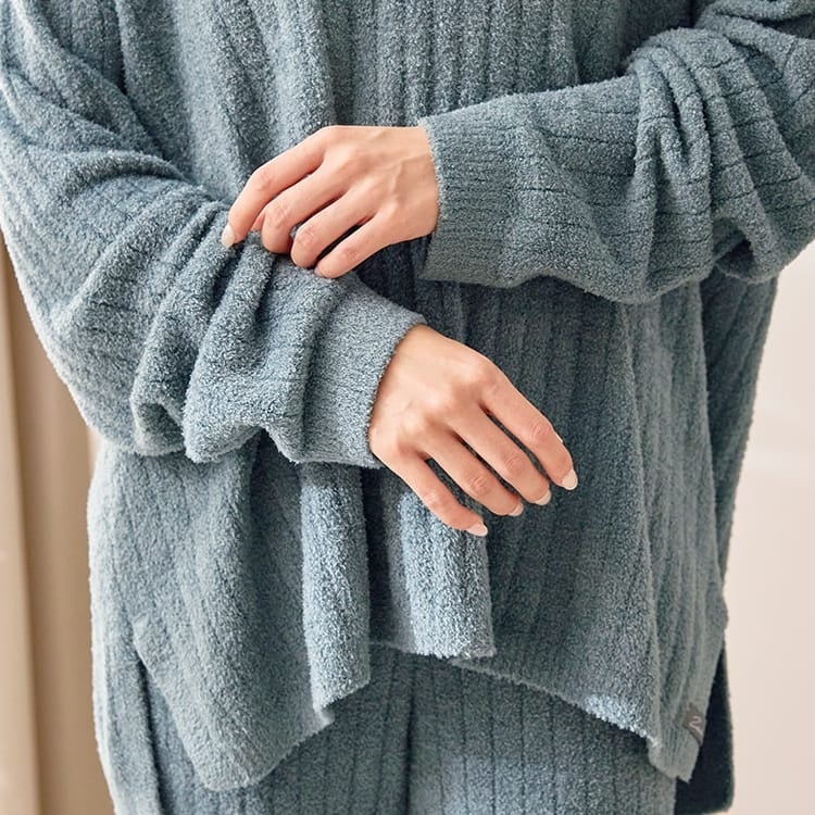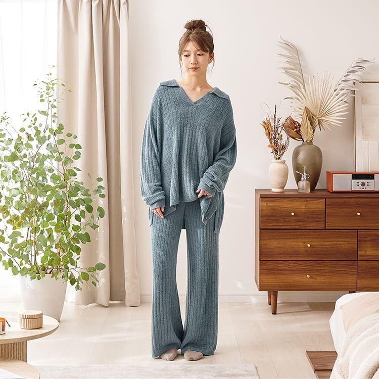これから涼しくなる季節にちょうどいい、「とろとろ」なめらか生地が特徴的な本ウェアは、おうちのなかでも優雅さとリラクシーな着こなしを実現するアッシュブルーを採用。顔周りをスッキリ見せ、ほんのり上品なデザインの「襟付きVネック」にご注目ください。