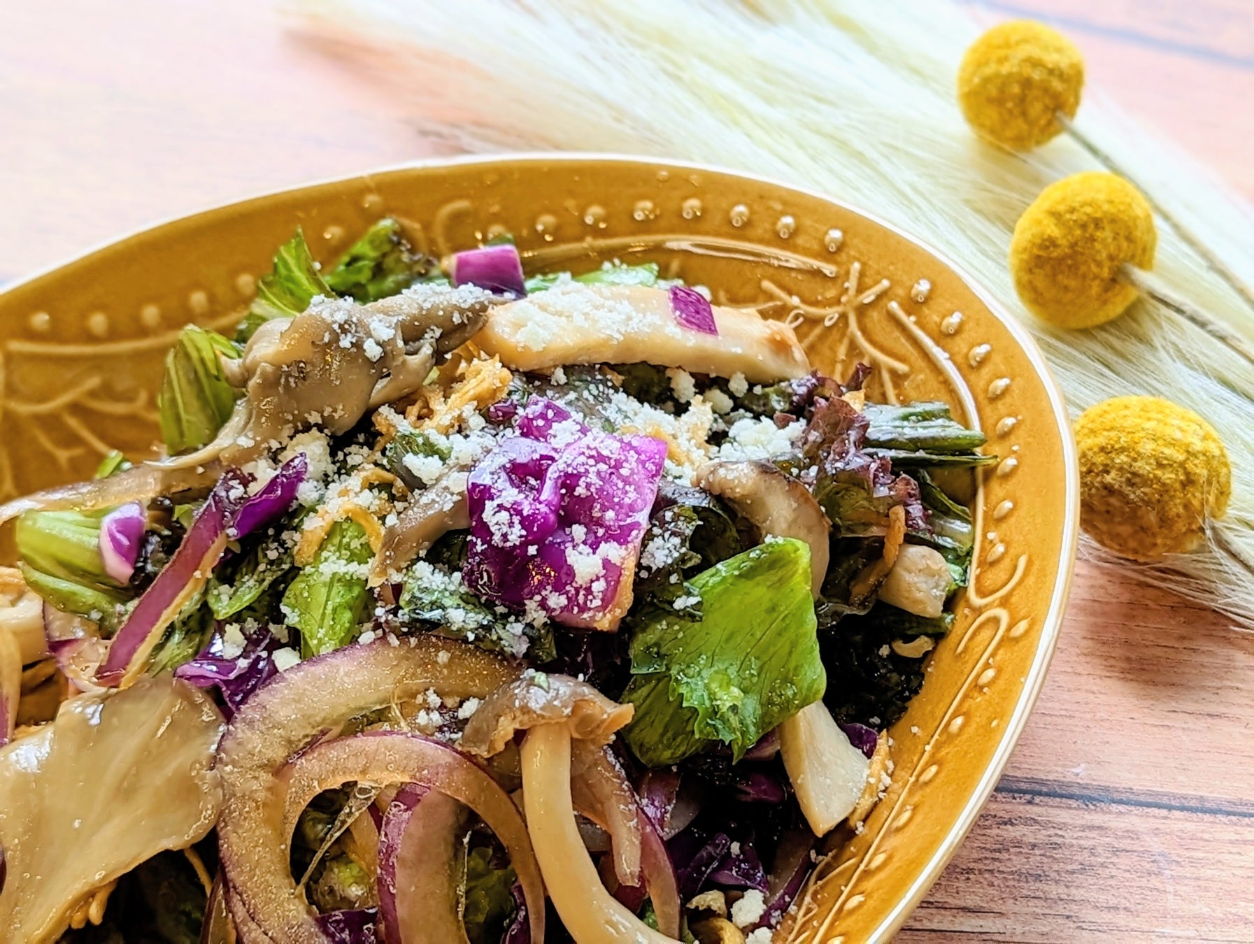 しめじ、エリンギ、まいたけと3種のきのこが主役。たまり醤油とオイスターソース、にんにくを合わせたドレッシングが食欲を刺激します。旨みを含んだ、コリコリ食感の切り干し大根がたまらない一品です。