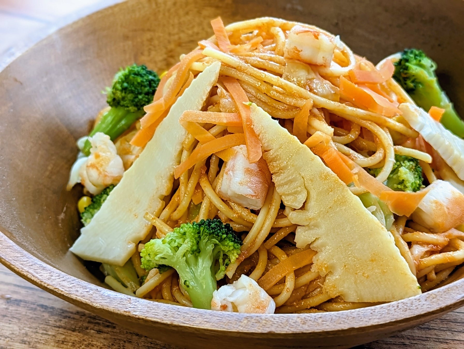 オマールブイヨンとトマトの旨みが凝縮した、濃厚なクリームソースのビスク風パスタサラダです。海老や筍、ブロッコリーなど、7種の具材と一緒にお楽しみください。