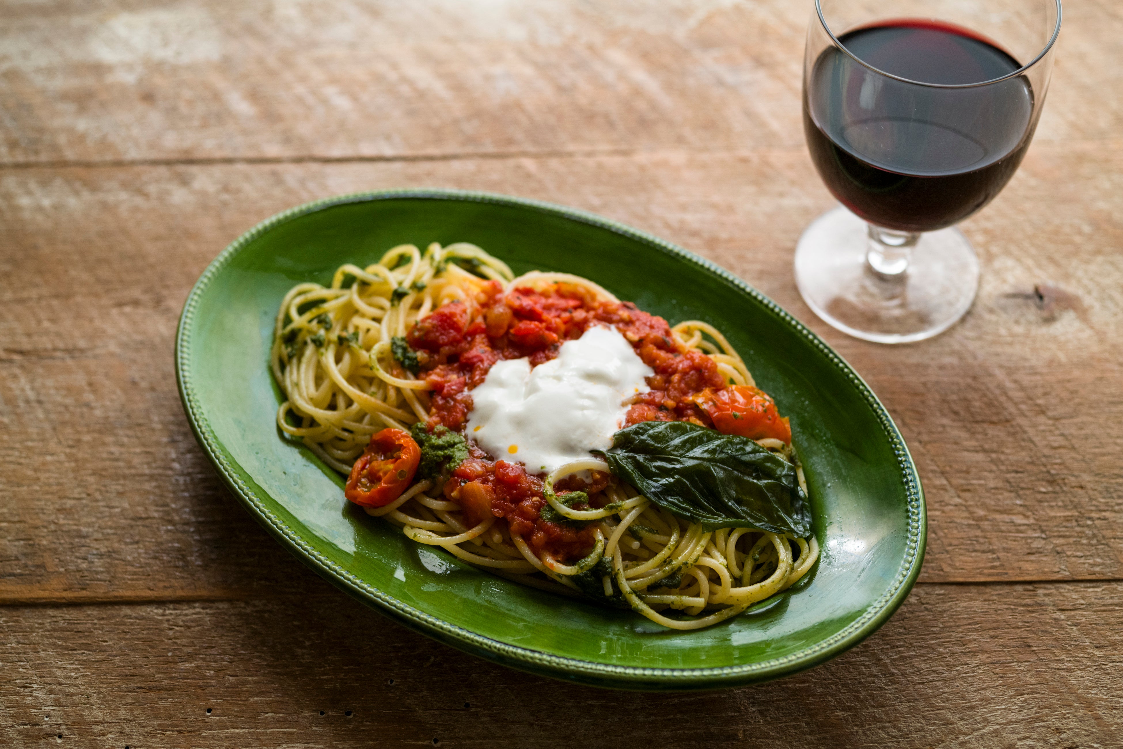 トマトの酸味とバジルの爽やかな香り、イタリア産リコッタチーズやパルミジャーノ・レジャーノの香りをお楽しみいただける一品です。トマトソースの上から、バジルとカシューナッツを粉砕して作った自家製のジェノベーゼソースをかけ、リコッタチーズ、セミドライトマト、揚げたバジルをトッピングしました。トマトソースにはマリナーラソースとトマトのほかにパルミジャーノ・レジャーノを使用することで、奥行きのある味わいに仕上げています。開発者のおすすめの食べ方はリコッタチーズを徐々にパスタ全体に絡めていただくこと。トマトソースの酸味とリコッタチーズのミルクのほんのりと優しい味わいが調和していく味の変化をお楽しみいただけます。