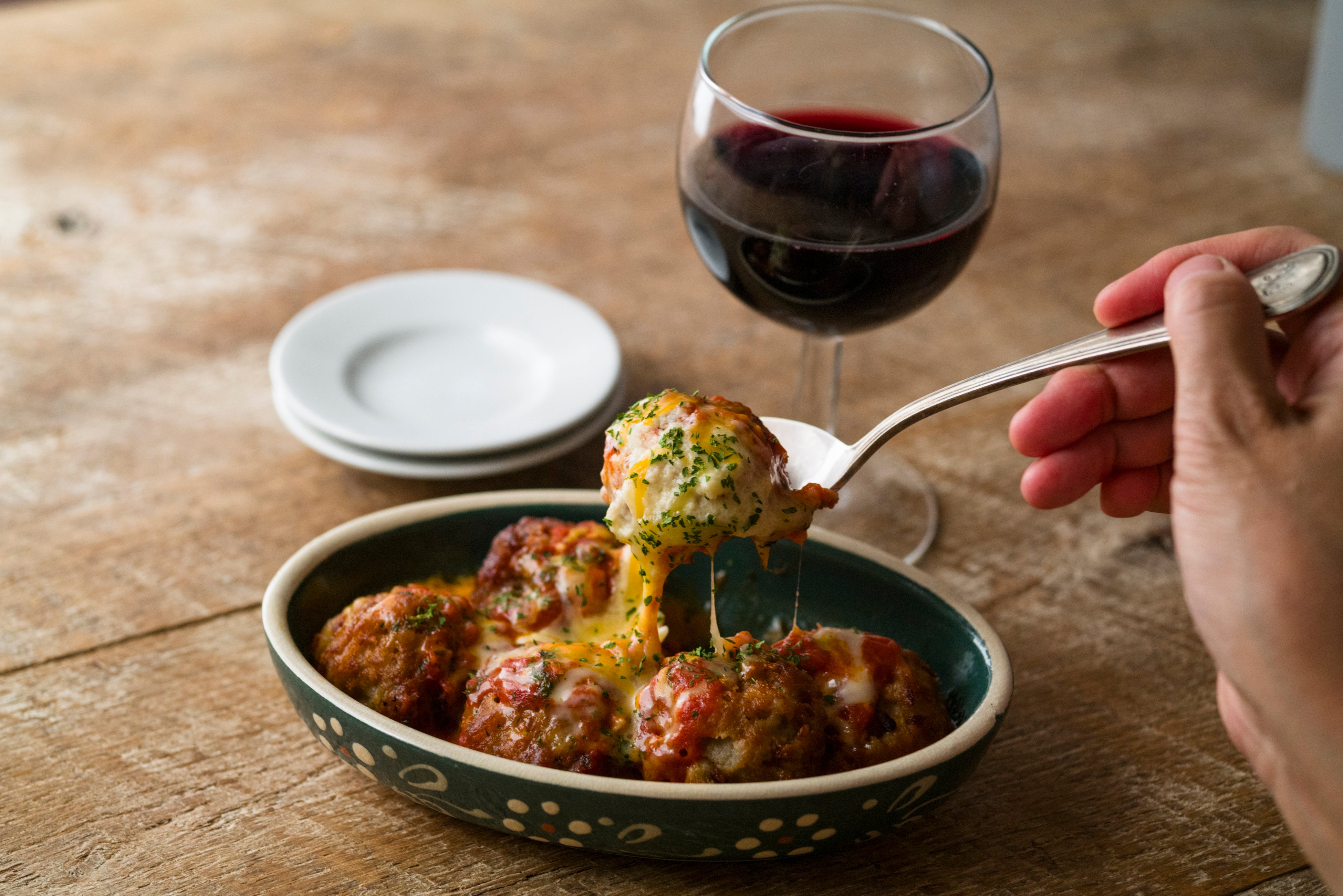 ローズマリーやナツメグを効かせた肉団子の上から、トマトソース、レッドチェダーを使用したチーズソースをかけ、その上からレッドチェダー、モッツァレラ、ゴーダの3種類のチーズをトッピングしました。チーズソースに使用するチーズは粘度や味の観点から何度も試作を行い、見た目にも鮮やかなレッドチェダーを採用しました。