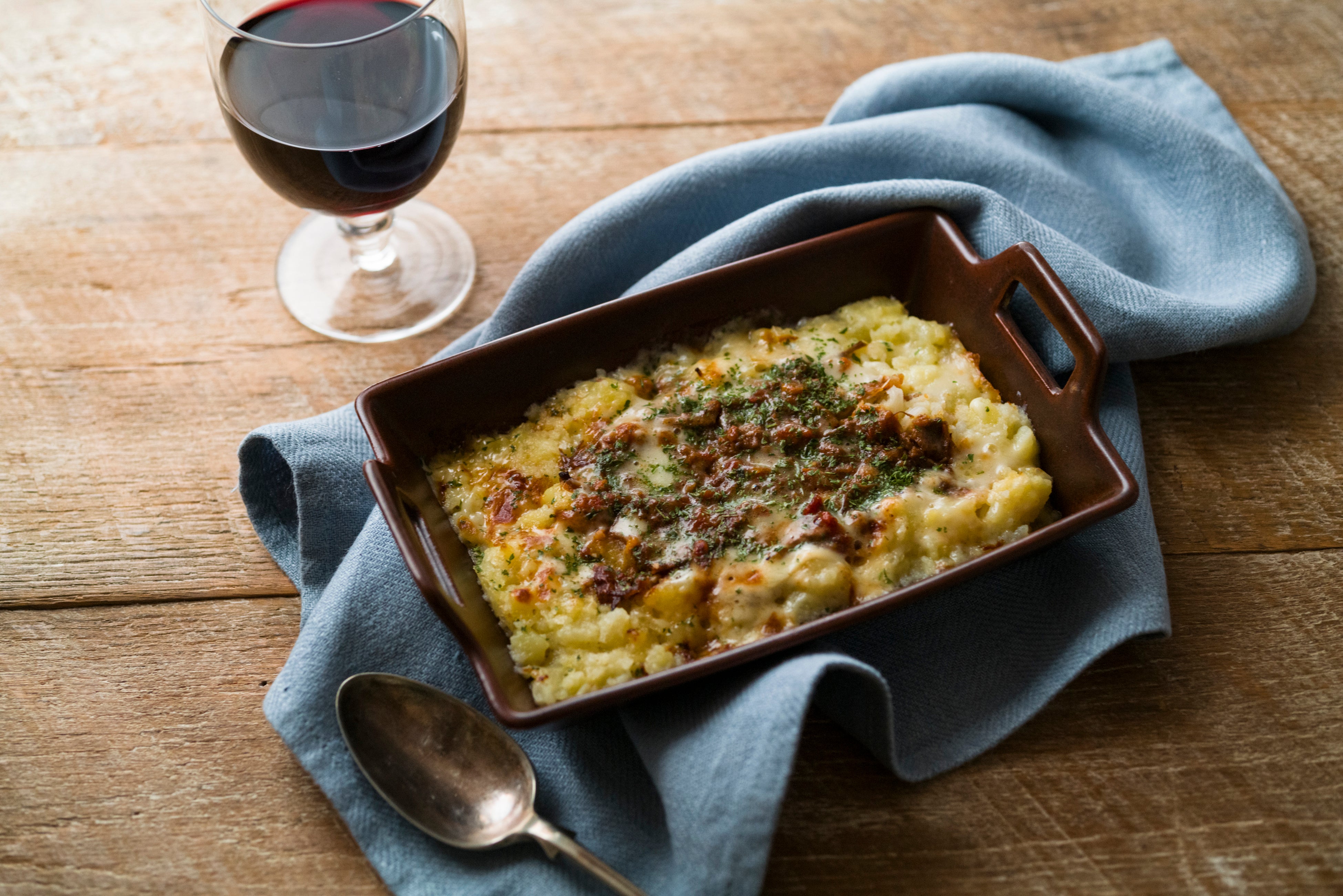 ナツメグを効かせたグラタンソースとじゃがいもを絡めた具材の上から、3時間以上煮込んだ牛ホホ肉と野菜の旨みが詰まったラグーソースをかけて焼き上げました。じゃがいもは、一番おいしいと言われる皮と実の間を残すため、蒸し上げてから一つひとつ手作業で丁寧に皮を剥いています。濃厚なラグーソースと、モッツァレラ、ゴーダ、パルミジャーノ・レジャーノの3種類のチーズで旨みとコクのある味わいに仕上げた、食べ応えのあるグラタンです。