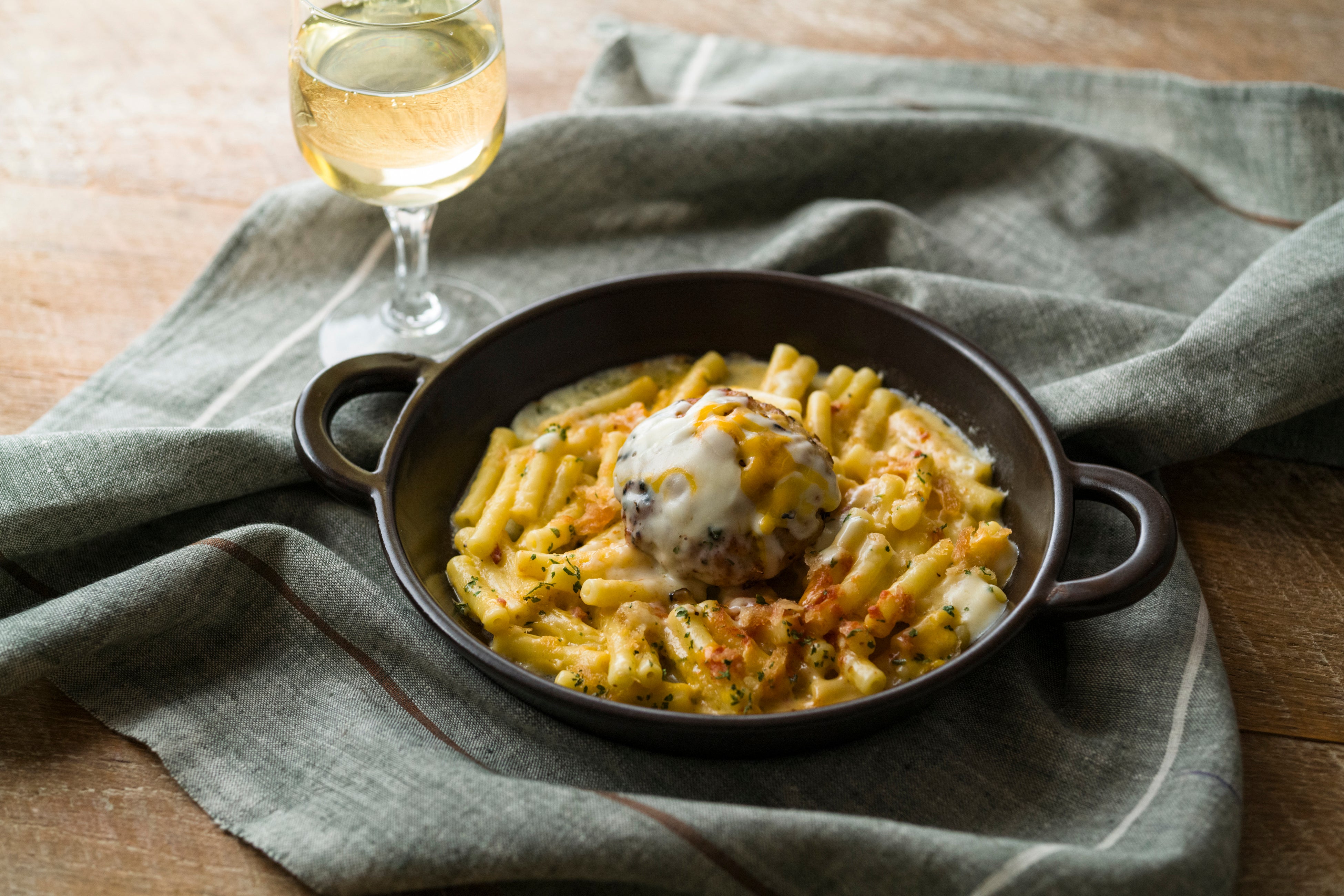 国産豚肉を使用したふっくらと柔らかいハンバーグと、チーズソースを絡めたマカロニを一皿でお楽しみいただける、ボリューム感のある商品です。チーズソースは、レッドチェダー、クリームチーズの2種類のチーズに加え、ベシャメルソース(小麦粉とバターで作られたルーを牛乳でといて煮詰めて作る白いソース)とバター、細かく刻んだベーコンなどを入れて作ることで、コクのある味わいに仕上げました。さらに、モッツァレラとレッドチェダーを上からふりかけた、まさにチーズ尽くしの一品です。