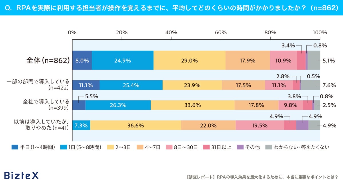 担当者がRPAの操作を覚えるまでの平均時間を尋ねたところ、全体では、「2~3日」という回答が最も多く、29.0%でした。