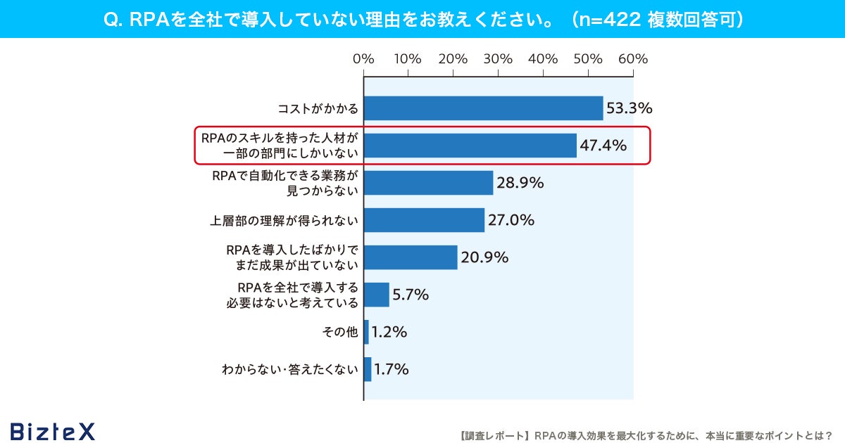 主な理由は「コストがかかる(53.3%)」、「RPAのスキルを持った人材が一部の部門にしかいない(47.4%)」であることがわかりました。