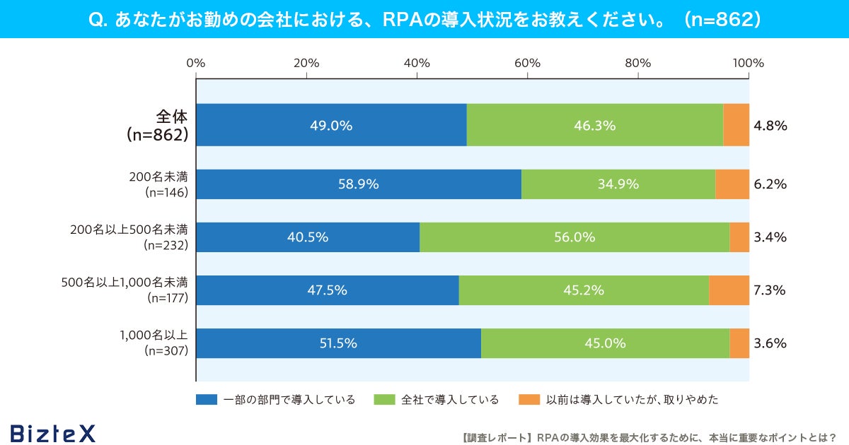 【調査レポート】RPAの全社導入率は、従業員数200名以上500名未満の企業が56%と最も高い。大企業では部門をまたいだ導入に障壁。