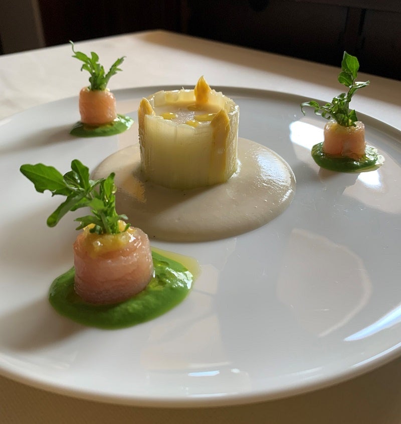 ●ホワイトアスパラガスのシャルロット ソースヴィシソワーズ、薫香を纏ったイワナとクレソンの香り、キャビアを添えて