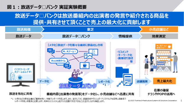 東芝インフラシステムズ株式会社は、放送機器事業におけるDXの取り組みの一環として、番組で扱う商品に関する放送データを小売業等に提供し、放送データがどのように活用できるかを検証し、その可能性を検証する実証実験を本日から行います。なお、本実証は放送局の協力の下に行います。