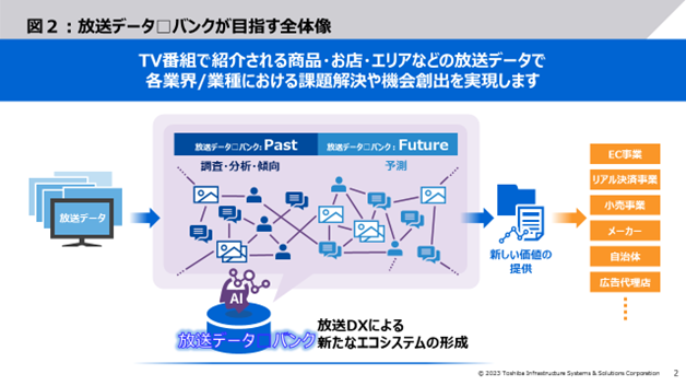 当社は、放送データを東芝グループのAI・認識技術、業務ノウハウなどを活用し、放送データを自動的にメタ化・蓄積・分析して提供する放送データ☐バンク(Enhanced Metadata of Broadcasting as a Service)というプラットフォームを構想し開発中です。放送データ☐バンクは、テレビ番組で紹介される情報をメタ化・管理し、各業界・業種における課題解決や機会創出・拡大を実現していきます。