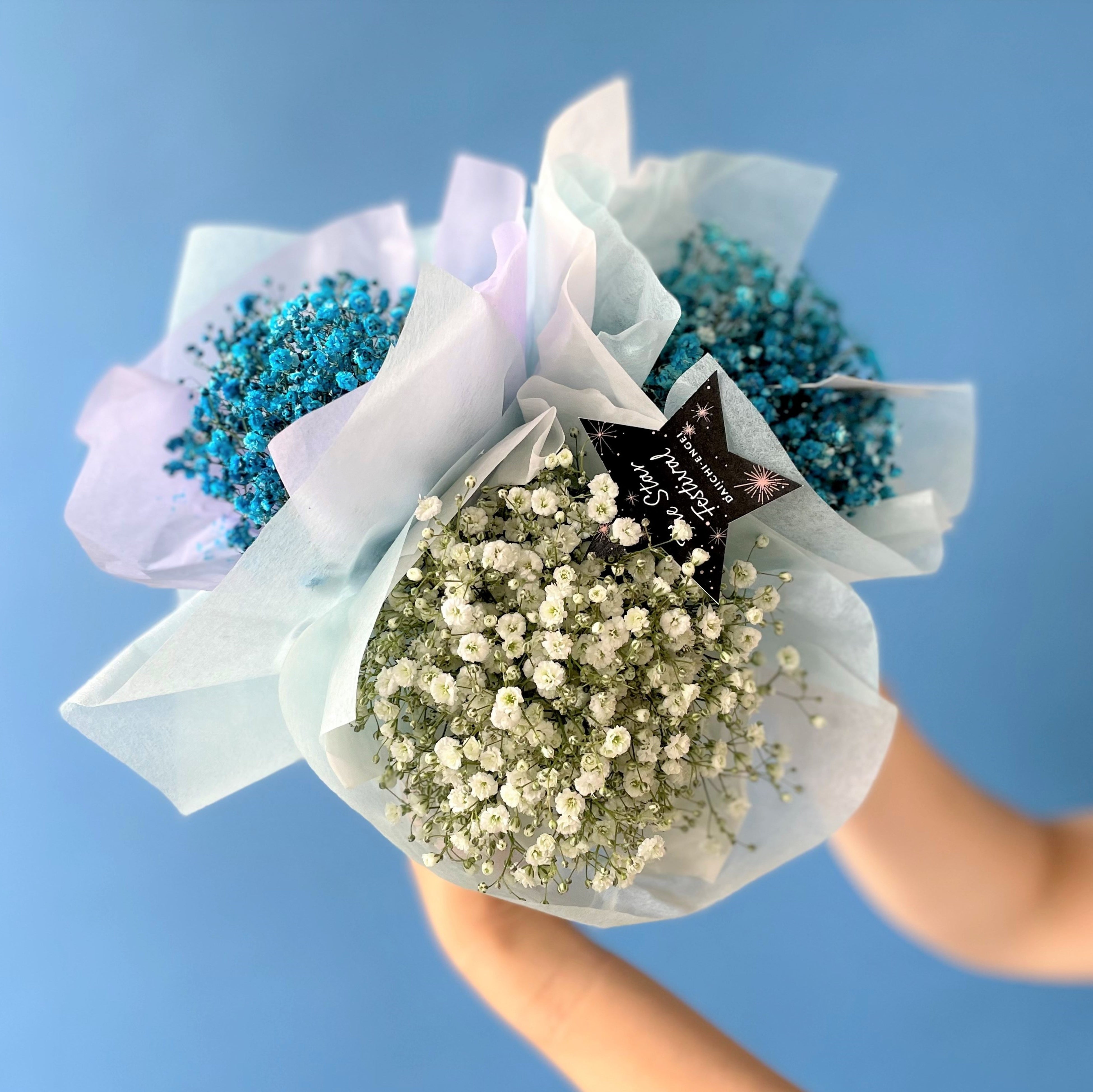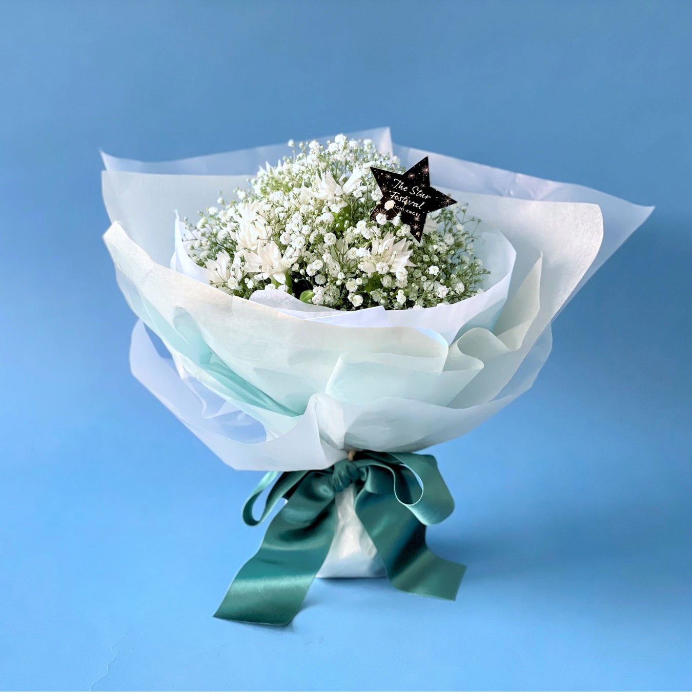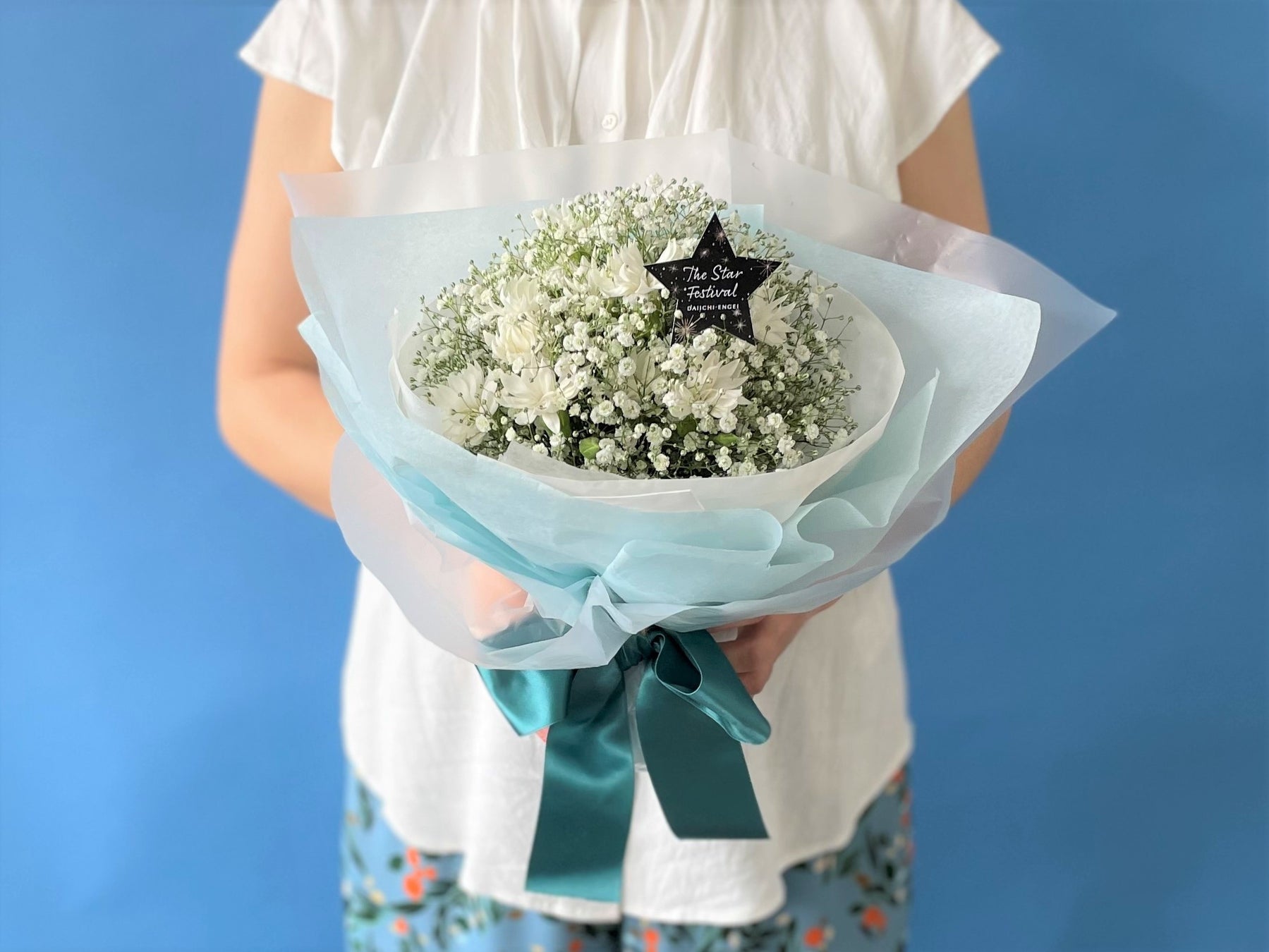 たっぷりのカスミソウと星咲きカーネーションをぎゅっと束ねたキュートなブーケ。ふわふわのラッピングは織姫の羽衣をイメージしています。