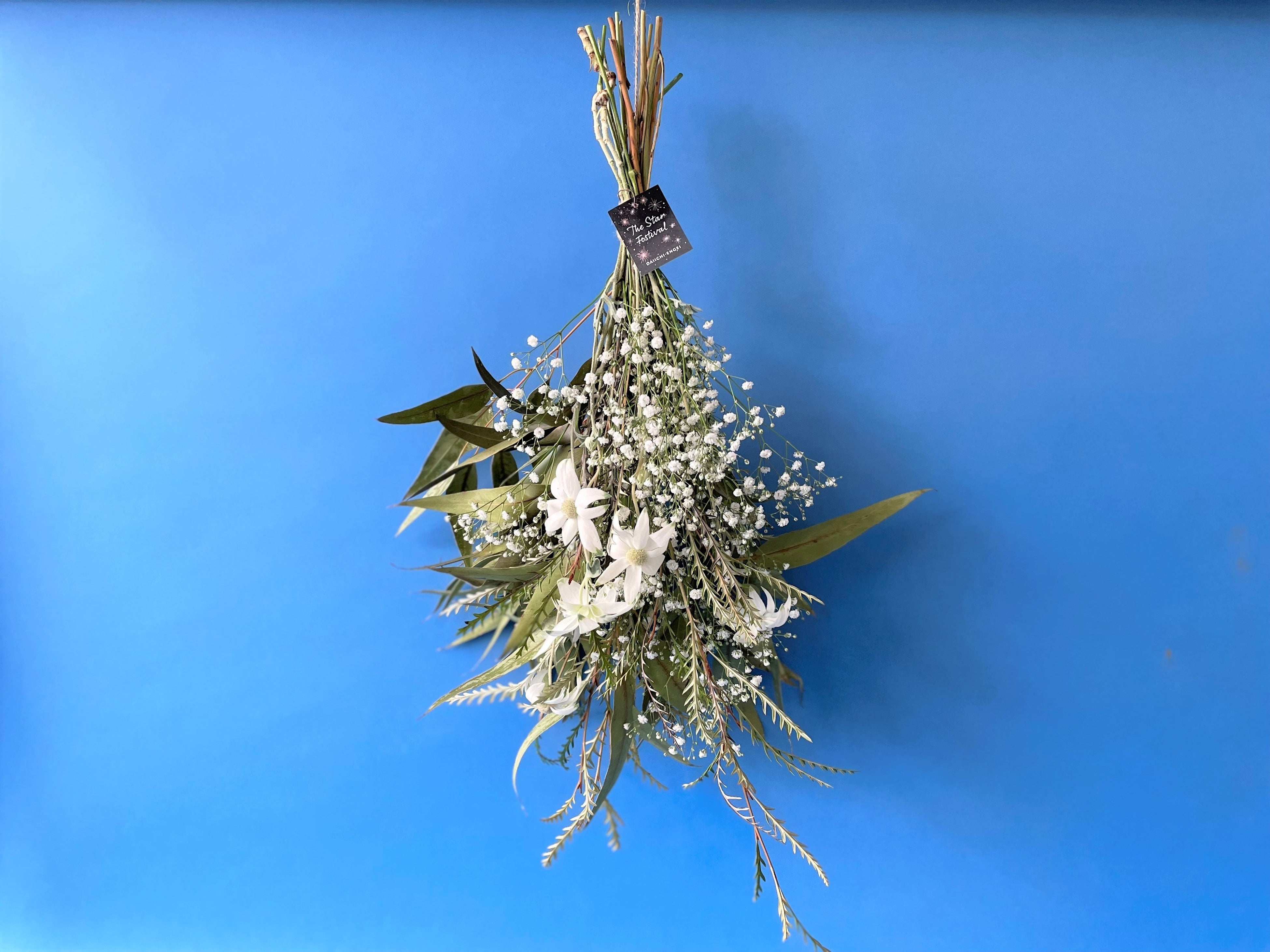 (右上)カスミソウとグリーンを束ねた定番のスワッグスタイル。
