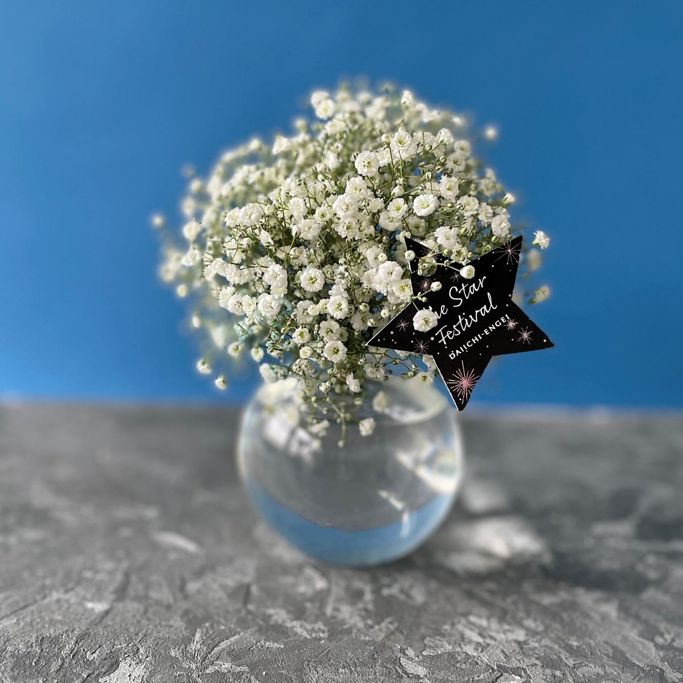第一園芸の各店舗では、夏の夜空に輝く天の川のような「七夕ブーケ」を販売します。星咲きの白いカーネーションとカスミソウを合わせて織姫の羽衣のようにふわふわのラッピングで包んだブーケや、カスミソウのみを束ねたお手頃なブーケなどで店頭を彩ります。