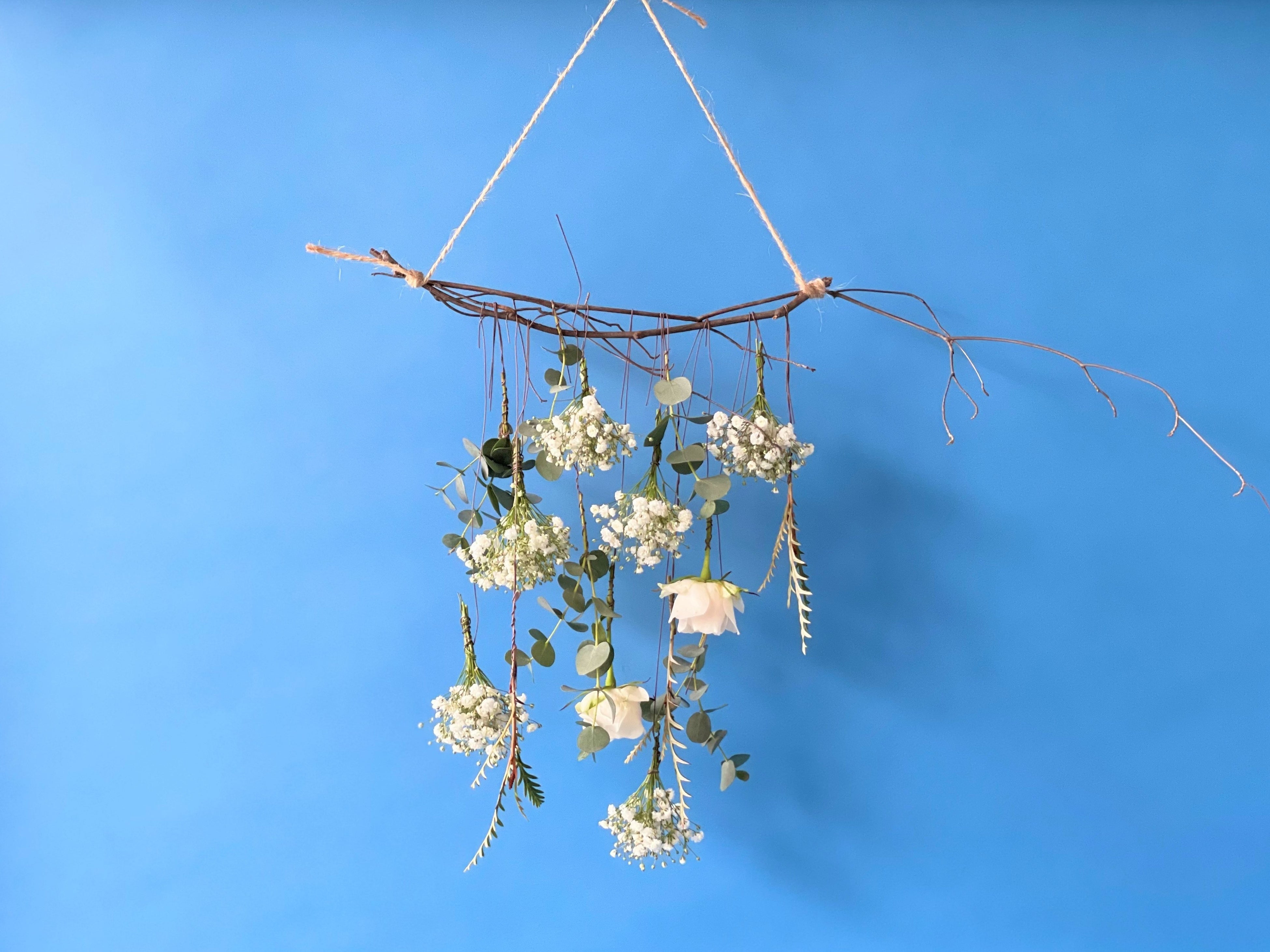 (左下)タペストリー型の壁飾り。束ねた枝から花や葉をワイヤーや紐でくくって下げます。お手入れで切り落とした葉や折れてしまった花でも。