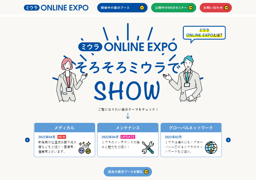第6弾では、メディカル(医療用・産業用)ブースを新設、メンテナンスブースをアップデートしています。「ミウラONLINE EXPO」、たくさんのご来場をお待ちしております!