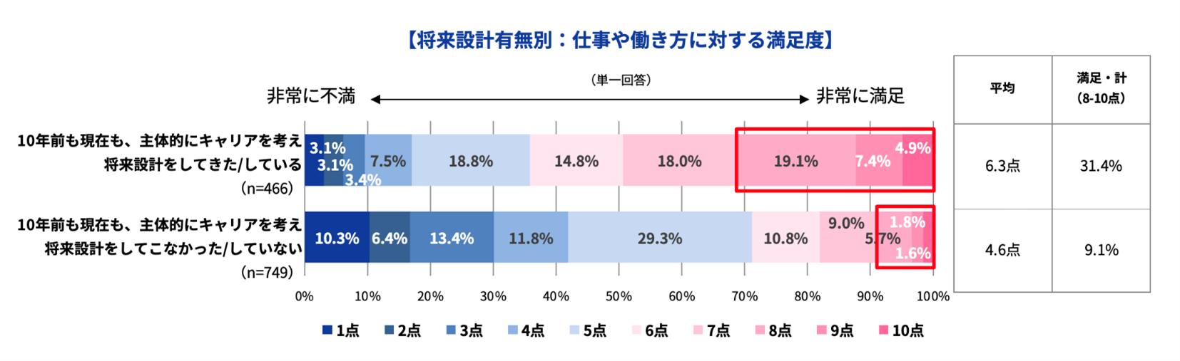 一方、継続して将来設計をしてきた人は「仕事や働き方に対する満足度が高い」割合が、将来設計をしてこなかった人の3.4倍