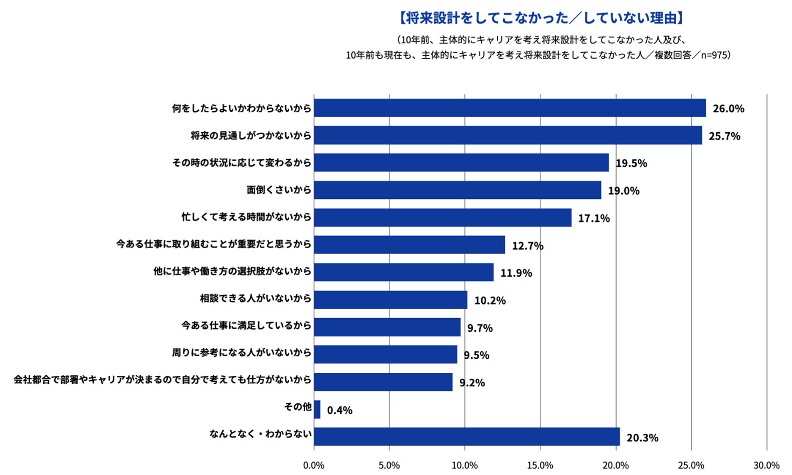 しかしながら実際は、キャリアを会社任せから個人主導へ意識を変えることはすぐには難しいと言えます。その背景に、将来設計をしていない理由として「何をしてよいかわからない」という結果も見えてきました。
