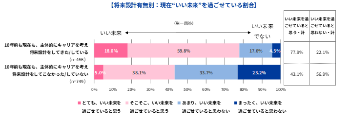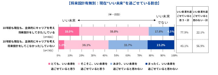 10年前も現在もともに「主体的にキャリアを考え、将来設計をしてきた/している」と回答した人の77.9%が「10年前の自分から見て現在は“いい未来”を過ごせている」と実感。将来設計をしてこなかった人が回答した割合(43.1%)の1.8倍。キャリア形成や将来設計が「“いい未来”を引き寄せている」可能性がある。
