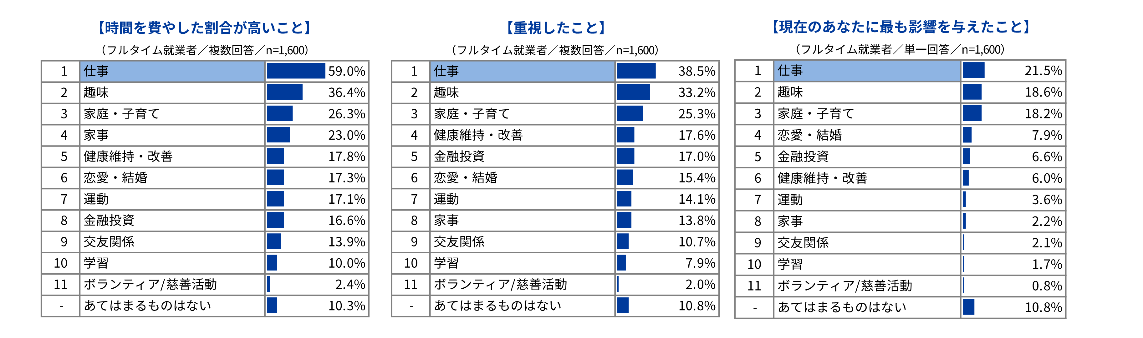 1. フルタイム就業者が、過去10年で最も時間を費やし、自分に影響を与えたことは「仕事」