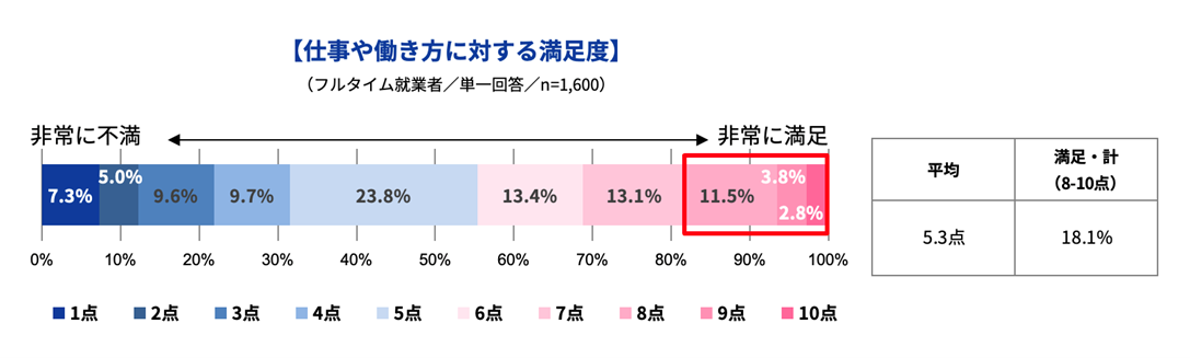 現在の「仕事や働き方に対する満足度」を点数化すると、高スコア(10点満点中8~10点)」の人の割合は2割以下の18.1%に留まる。