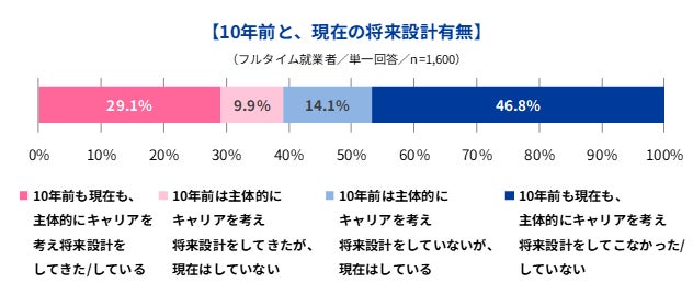 10年前と現在ともに「主体的にキャリアを考え、将来設計をしてきた/している」と回答した人は3割弱の29.1%。