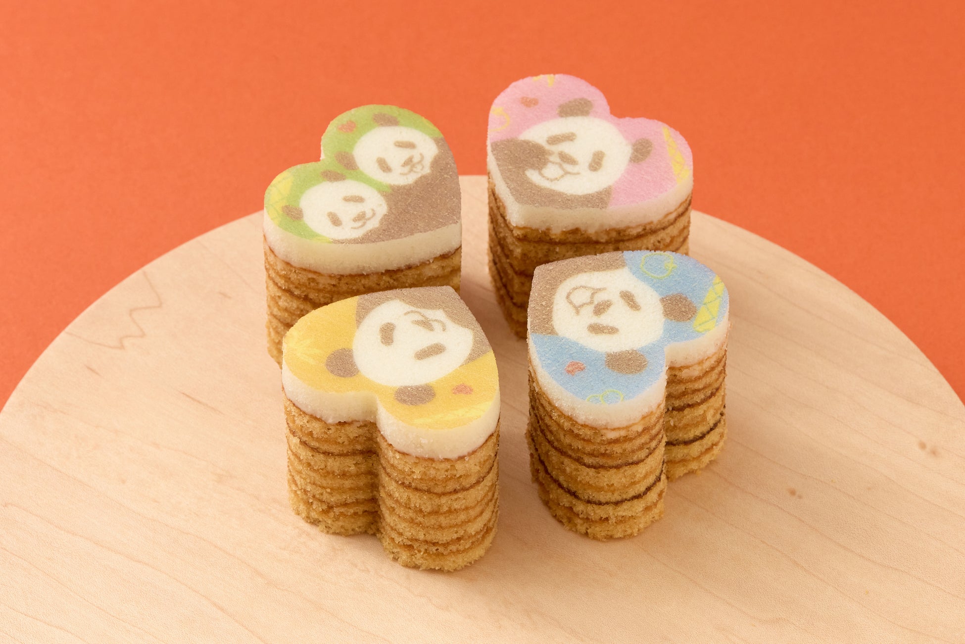 パカっ!と型抜きが楽しいバウムシリーズに、上野案内所オリジナルの新柄が登場。パンダの絵柄がハート型に型抜きできる、愛らしいデザインです。絵柄はリーリー、シンシン、シャンシャン、シャオシャオ&レイレイの全4種類(ランダム)。4つ並べると、かわいい四つ葉のクローバーにも。味はほのかな塩気とキャラメルのコクが溶けあう、塩キャラメル味です。箱外寸:約横60×縦85×幅48mm