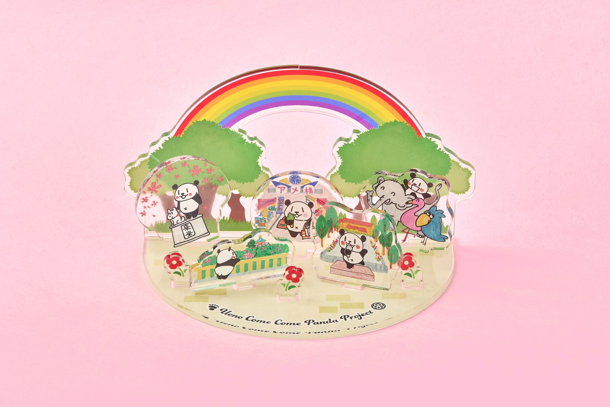 yokoさんのイラストを組み合わせ、上野の街をパンダたちが楽しむ様子を立体的に再現したアクリルジオラマです。全てを組み立てると、上野の賑やかで楽しい雰囲気と、未来への希望を感じる虹が机上に広がります。サイズ:A5サイズ(組み立て前)