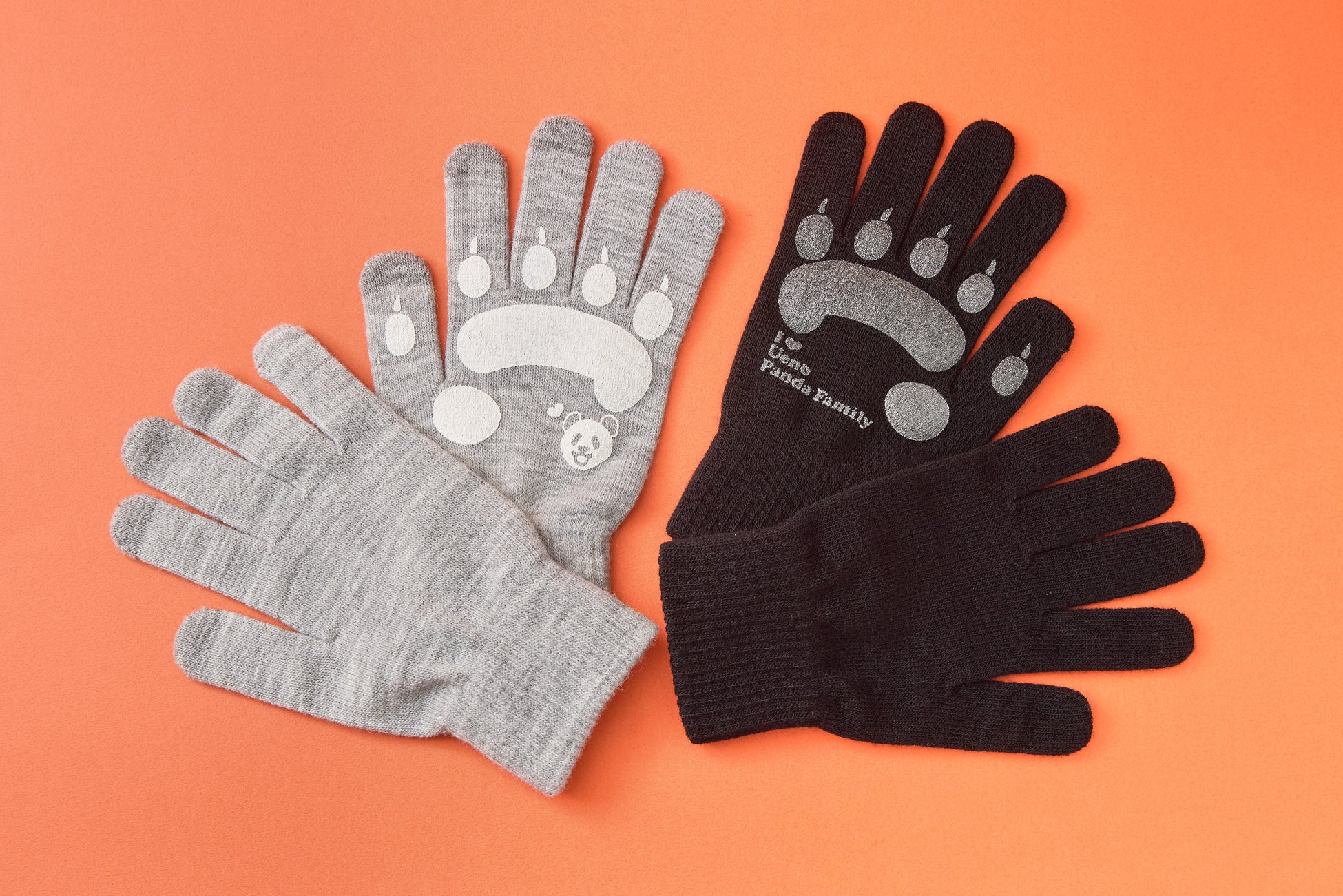 パンダの手のひら(肉球)をモチーフにしたデザインの手袋です。一見無地の手袋ですが、手のひら側には可愛らしい肉球や「I♡Ueno Panda Family」のメッセージがプリントされています。便利なスマホ対応。寒くなる季節にぴったりの、遊び心あふれるアイテムです。サイズ:全長約21cm±1cm、幅約13cm(フリーサイズ)