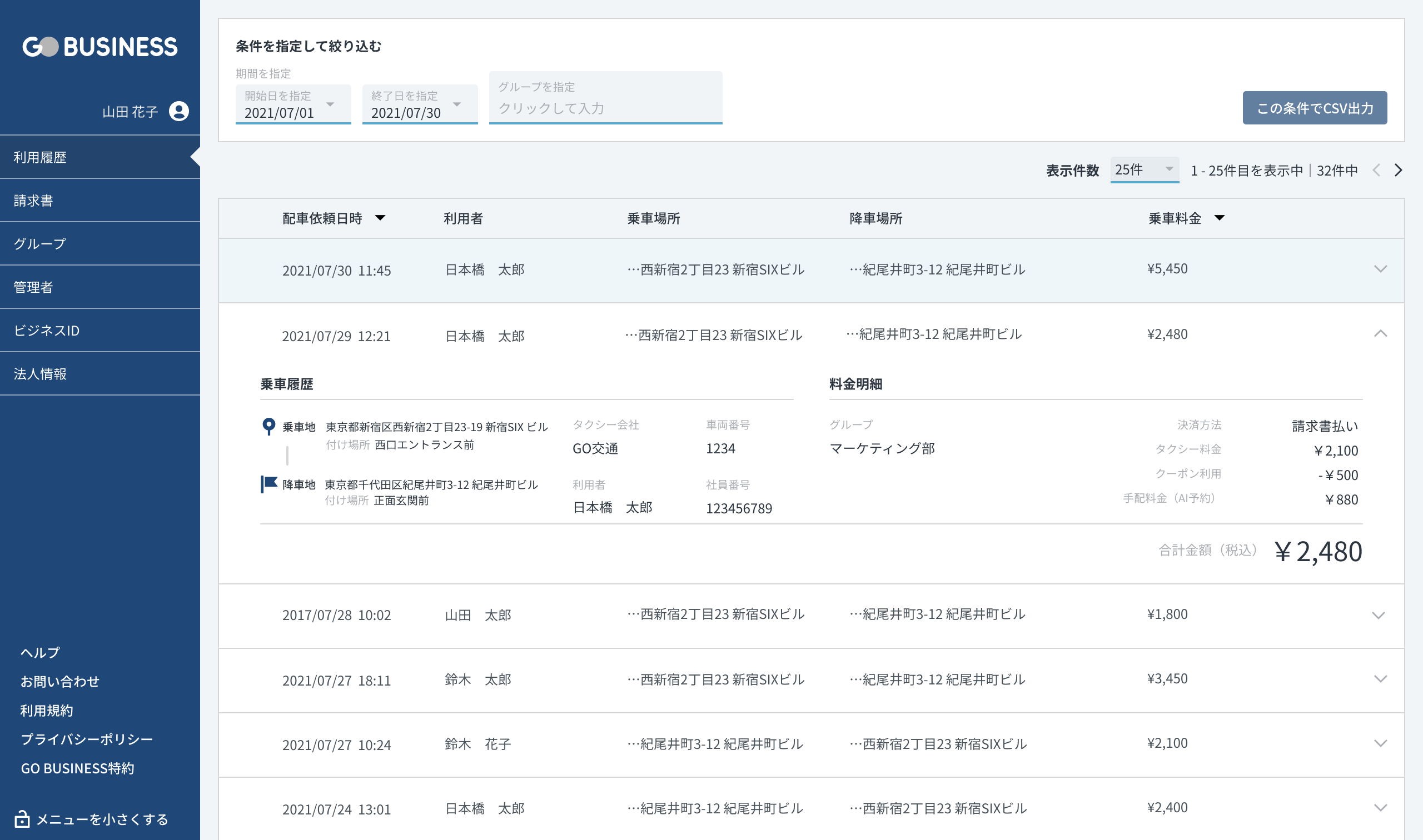 - 管理者向け機能 : 社員向けビジネスID発行、ビジネスID利用状況の確認、ビジネスID利用時の料金請求書払いなど