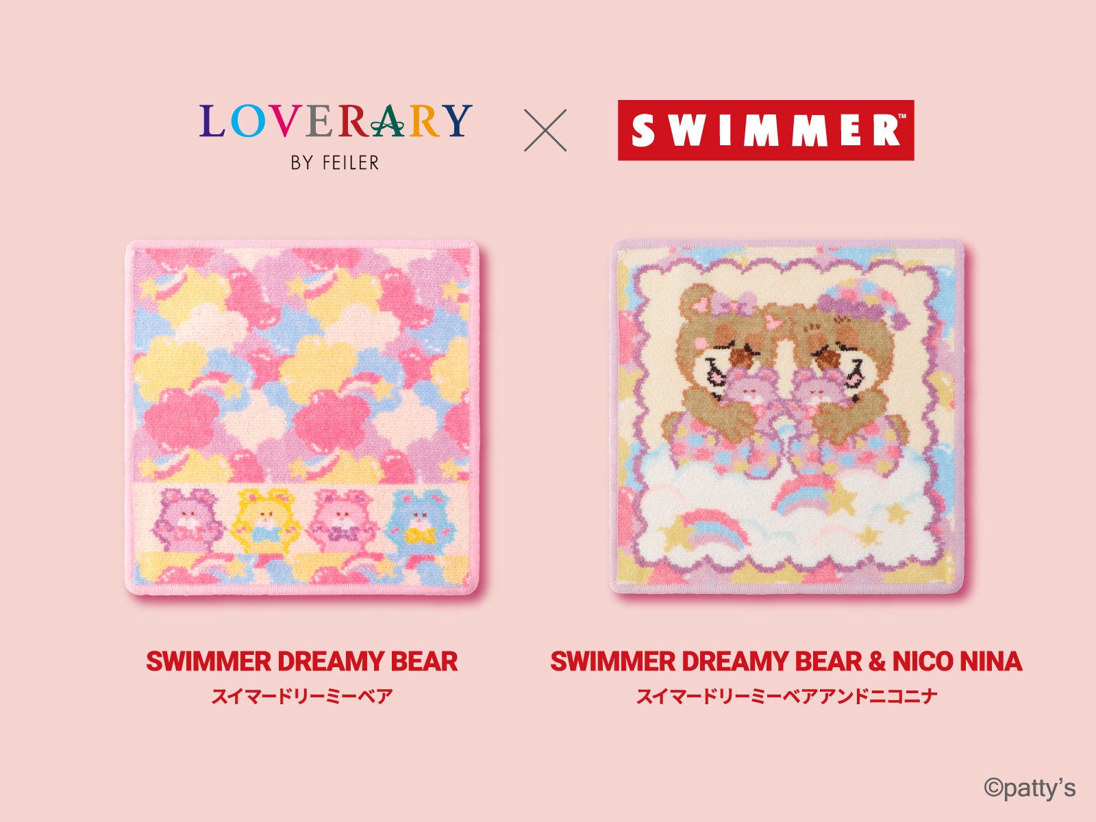 「SWIMMER」の世界に、ラブラリー バイ フェイラーで人気のくま“ラブラリーニコ”と“ラブラリーニナ”が登場!パステルカラーのパジャマを着て、スイマーのくまを抱いて、雲の上でスヤスヤ。二人とも楽しい夢を見ているようです。