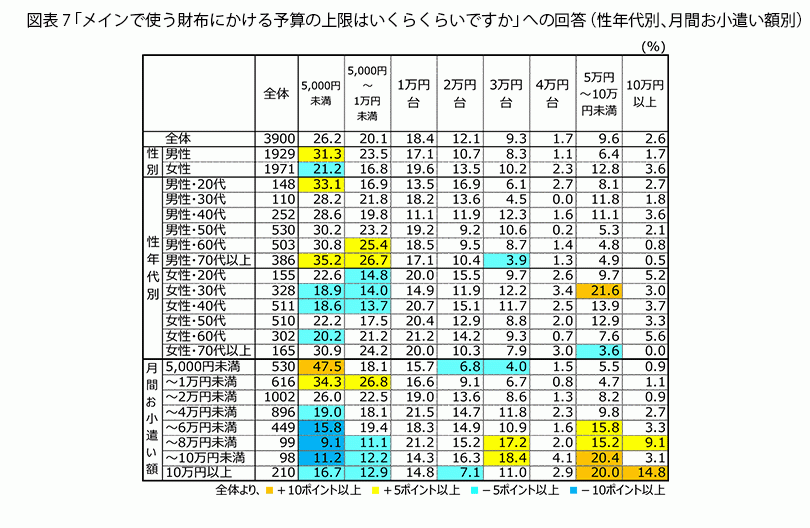 月間のお小遣い額別に見てみると、金額が大きいほどに財布の予算額も多い傾向があるのは納得がいく結果です。とはいえ、月間お小遣い額が“10万円以上”の人で「1万~4万円台」35.7%、「5万円以上」34.8%と差がないというのも、興味深いところです。