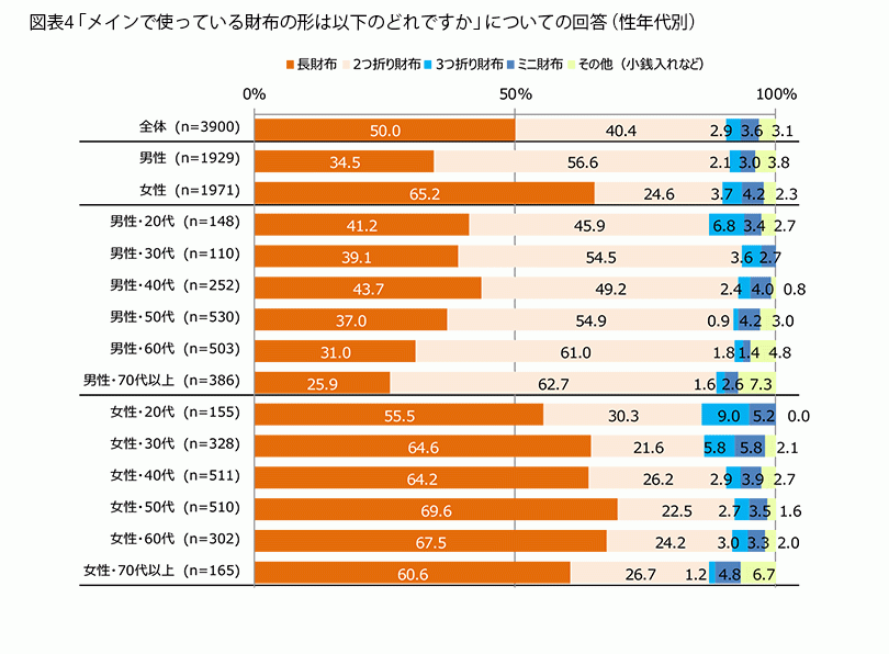 財布の【形】では(図表4)、「長財布」50.0%、「2つ折り」40.4%がツートップに。性別だと、男性56.6%が「二つ折り」、女性65.2%が「長財布」と男女差が鮮明に現れました。詳しく見ると、男性は20代では両者が拮抗しているのが、年代が上がるほど「2つ折り」が優勢に。一方で女性では一貫して「長財布」が20ポイント以上上回り、年代を問わず“長財布派”が多数を占めました。また最近流行の「3つ折り」や「ミニ財布」といったコンパクト型の財布は合計で6.5%ですが、男性20代や女性30代以下とでは1割強と、男女とも若年層で一定の支持を集めました。女性は小さめのバッグを持つ人が多いことも背景にありそうですね。