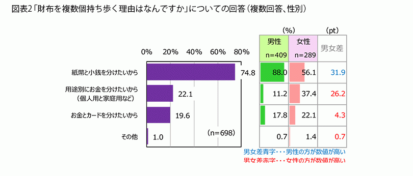 【財布を複数個持ち歩く理由】もきいたところ(図表2)、「紙幣と小銭を分けたいから」が4分の3と最多となり、特に男性は88.0%と女性より31.9ポイントも高値に。「用途別にお金を分けたい」では逆に女性が26.2ポイント上回りますが、これは女性の方が家計を管理するケースが多いことを反映しているのかもしれませんね。3位の「お金とカードを分けたいから」19.6%は男女差は4.3ポイントに拮抗。“小売店のポイントカードなども増えがちなので、お金と分けて管理したい”と考えるのは男女共通のようです。